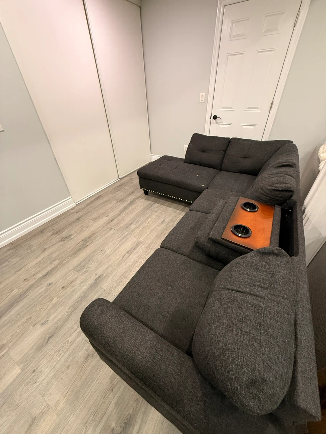 This dark grey sectional sofa features a chaise lounge and a built-in wooden tray with cup holders. It's upholstered in a durable fabric and accented with decorative nailhead trim. This piece is great for relaxing and entertaining!