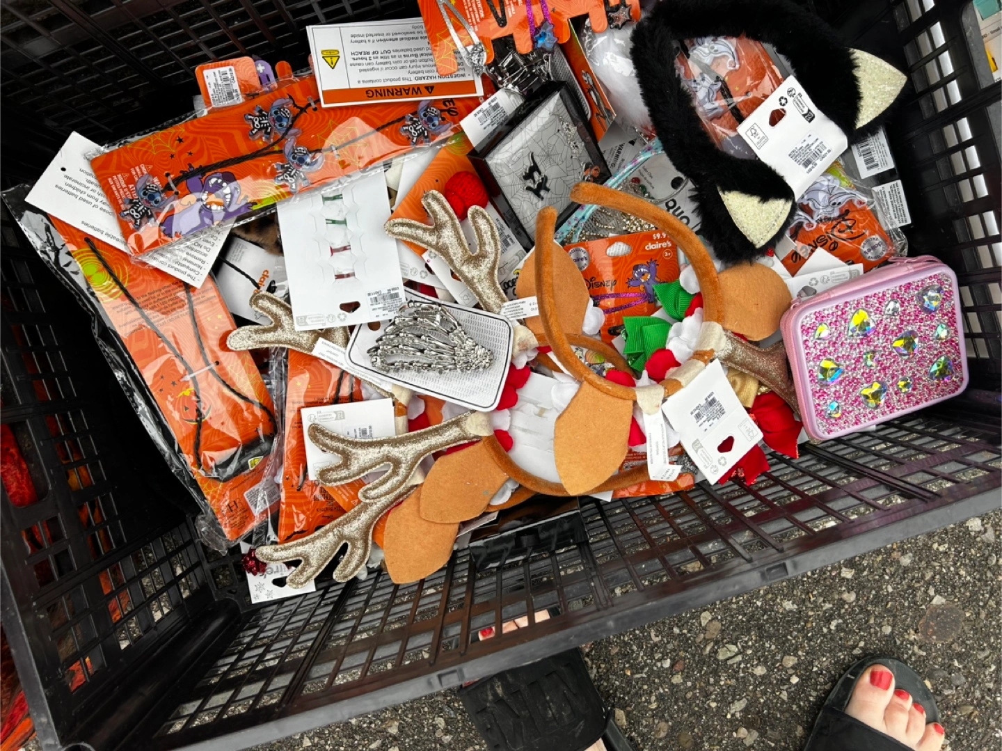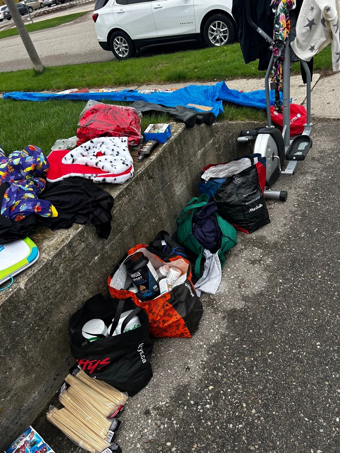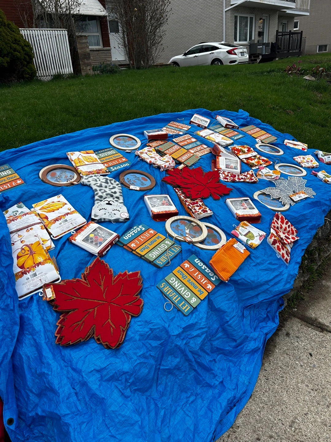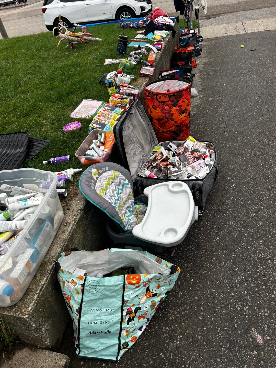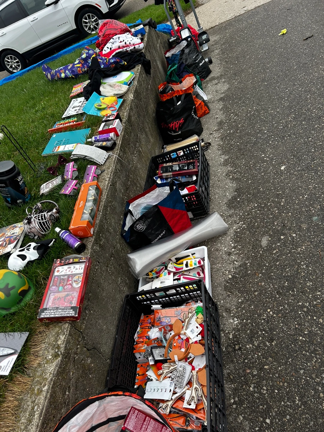 Huge yard sale lot! Includes various Halloween costumes and masks, holiday decorations, kitchen textiles, and other miscellaneous items. Some items are new with tags. Perfect for crafting or resale. Grab a bargain! Tons of brand new makeup 2$ skin care 5$ and much more all new Woman’s items come take a look