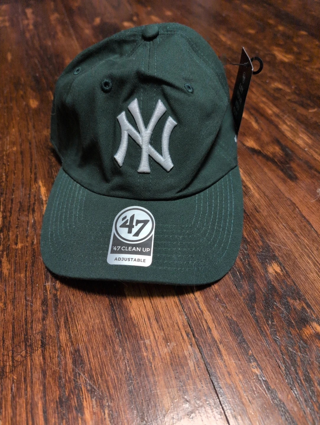This is a forest green New York Yankees MLB Clean Up Cap by 47 Brand. It's an adjustable strapback style. It's made of cotton.