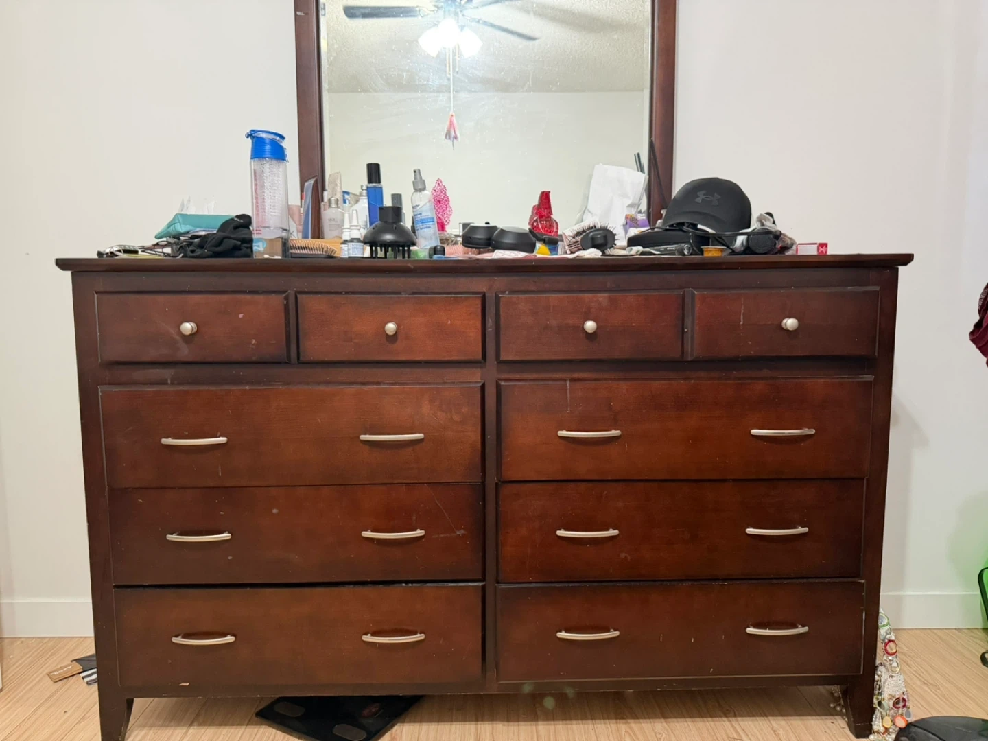 This dark wood dresser features six drawers for ample storage. It's made of solid wood with silver-toned hardware. It's a sturdy piece of furniture for any bedroom.