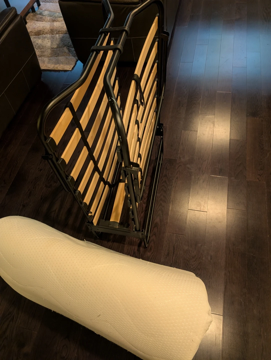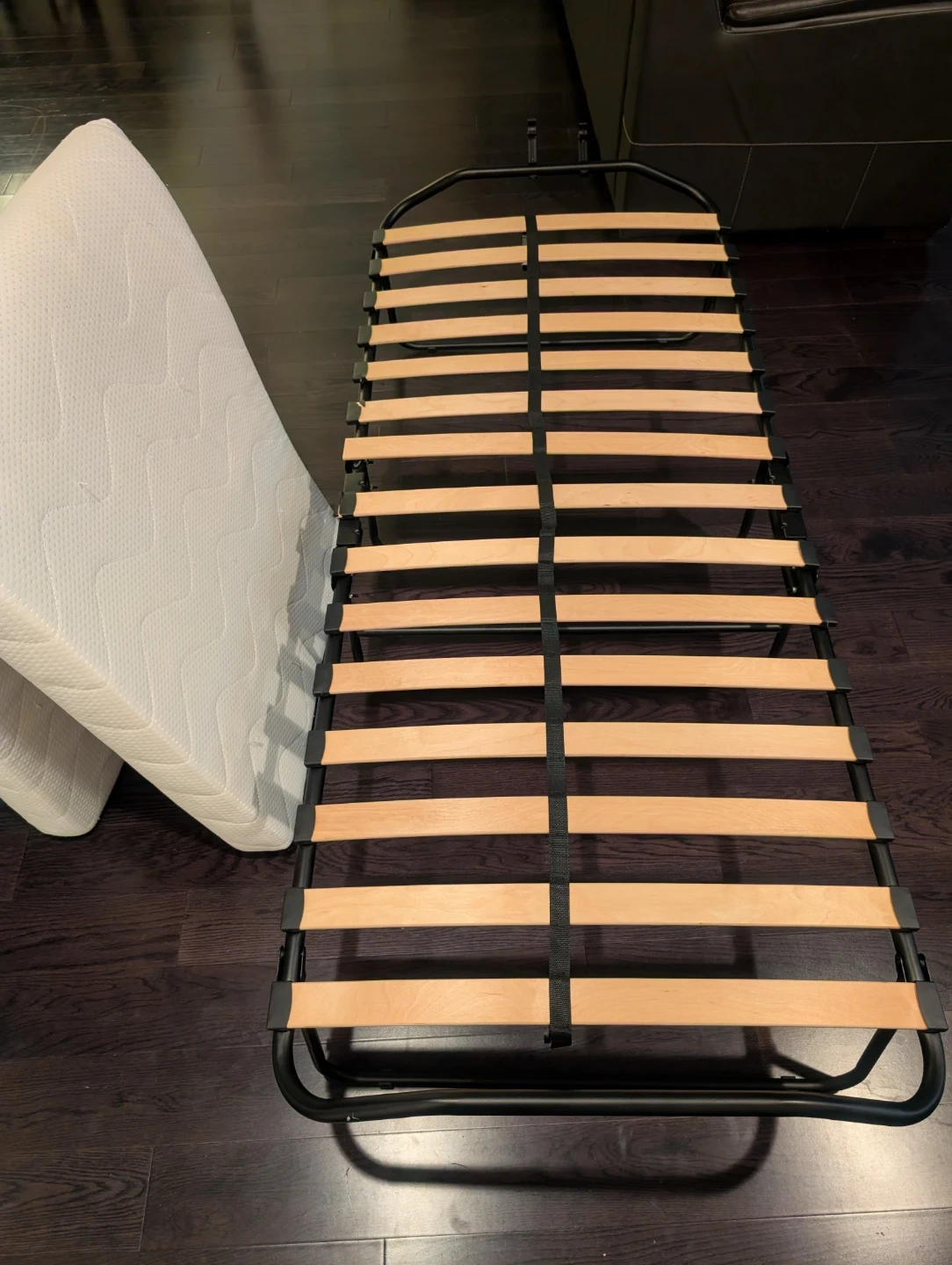 Selling a user folding bed frame that comes with a mattress. It's a great space-saving solution for guests or smaller rooms. The frame is sturdy and easy to fold up when not in use. The mattress is comfortable and in good condition. Perfect for anyone needing an extra bed without taking up too much space! We used it occasionally for guests