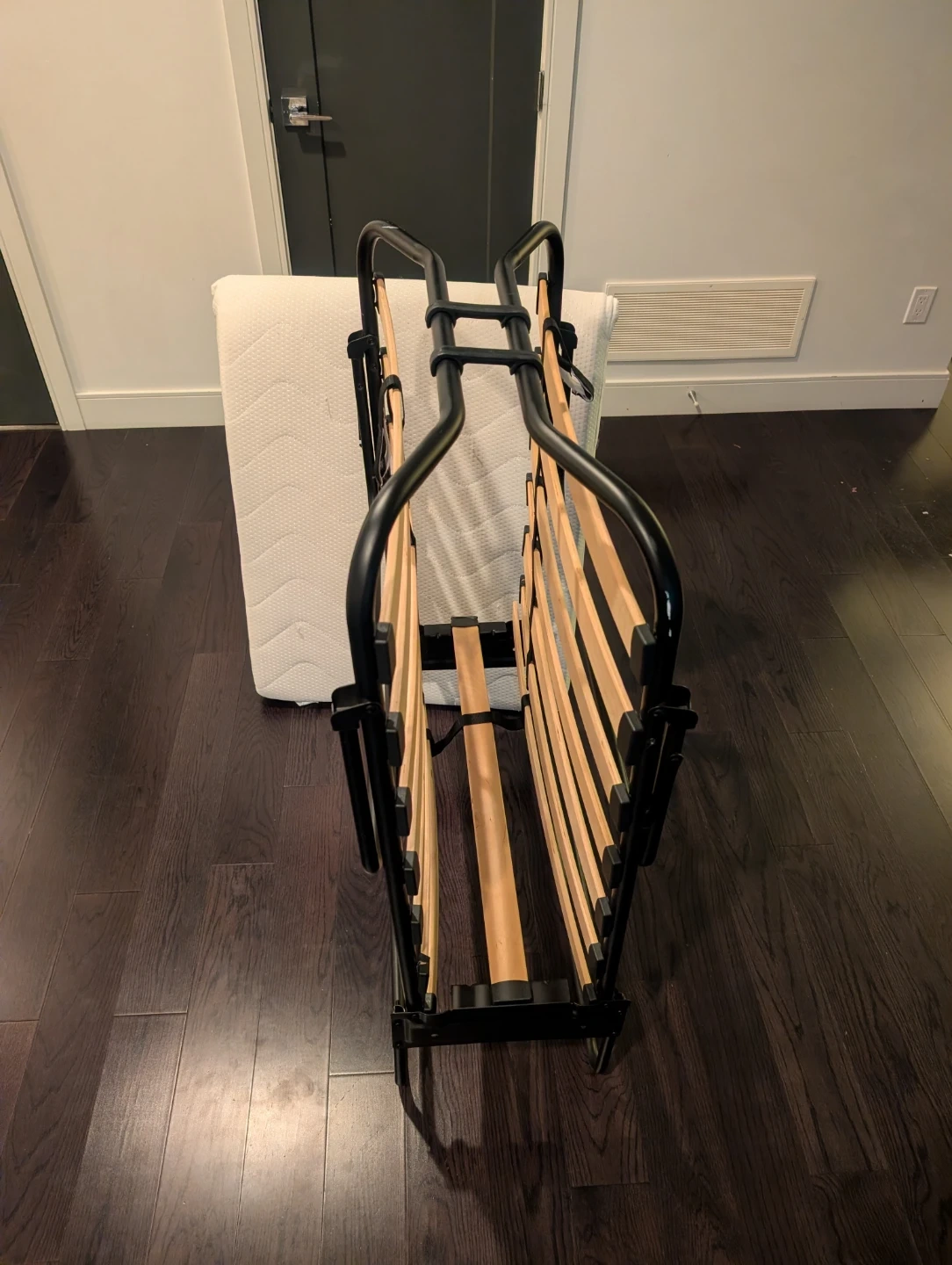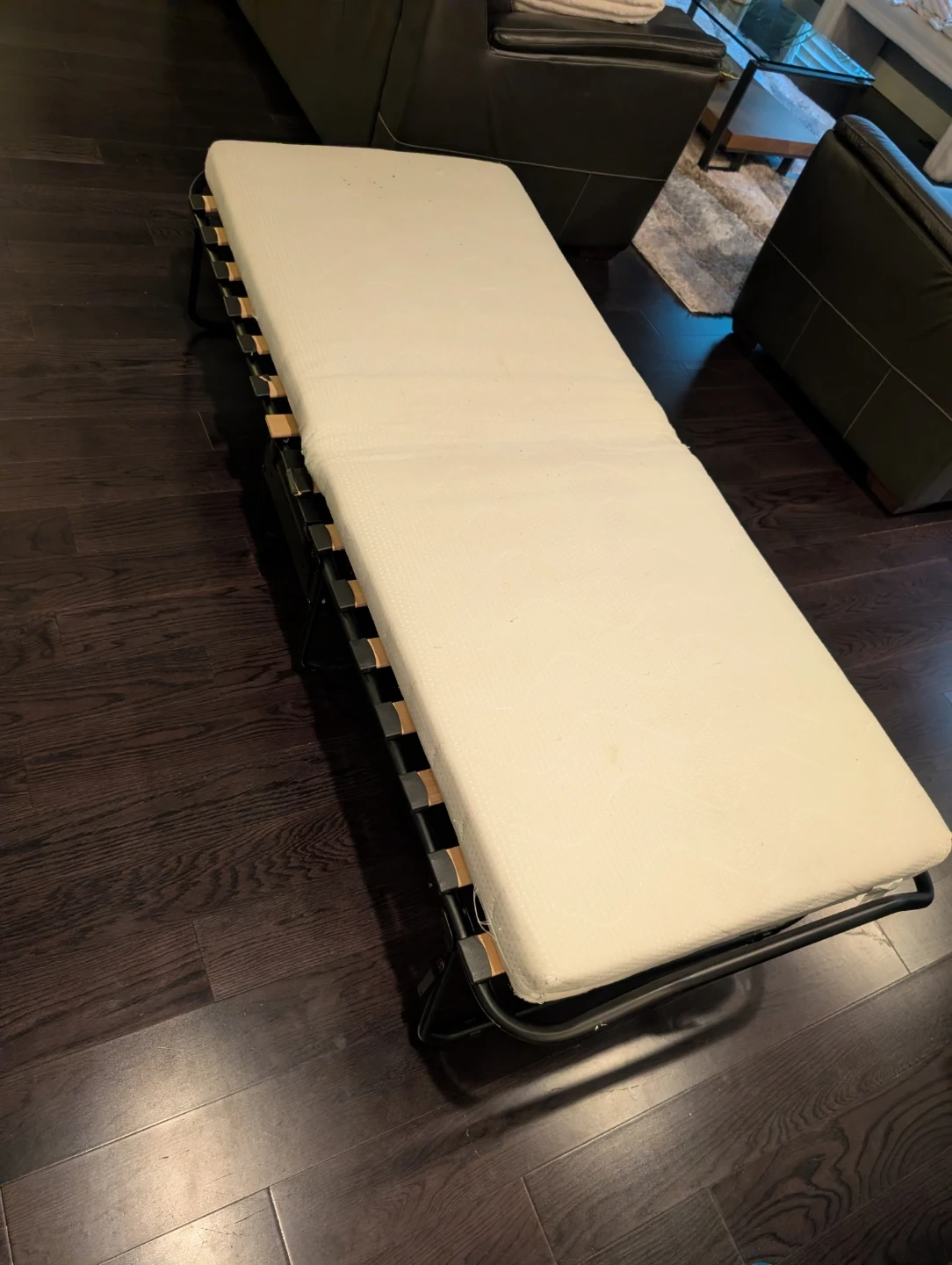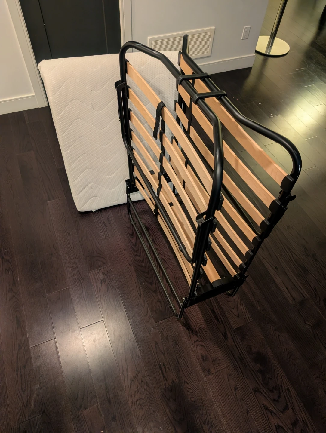 Selling a user folding bed frame that comes with a mattress. It's a great space-saving solution for guests or smaller rooms. The frame is sturdy and easy to fold up when not in use. The mattress is comfortable and in good condition. Perfect for anyone needing an extra bed without taking up too much space! We used it occasionally for guests