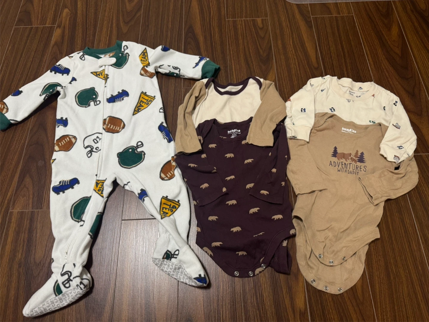 This bundle includes three baby outfits. One is a white footie sleeper with a football theme. There's also a burgundy bodysuit with a bear pattern and a tan bodysuit with "Adventures with Daddy" text and a bear graphic.