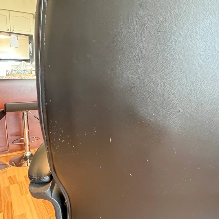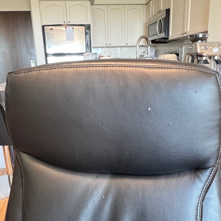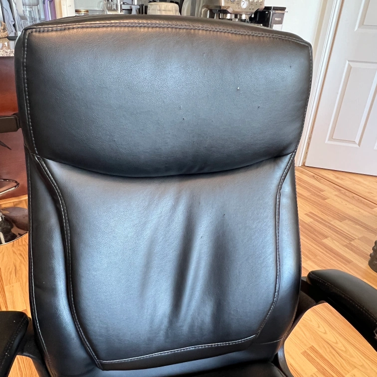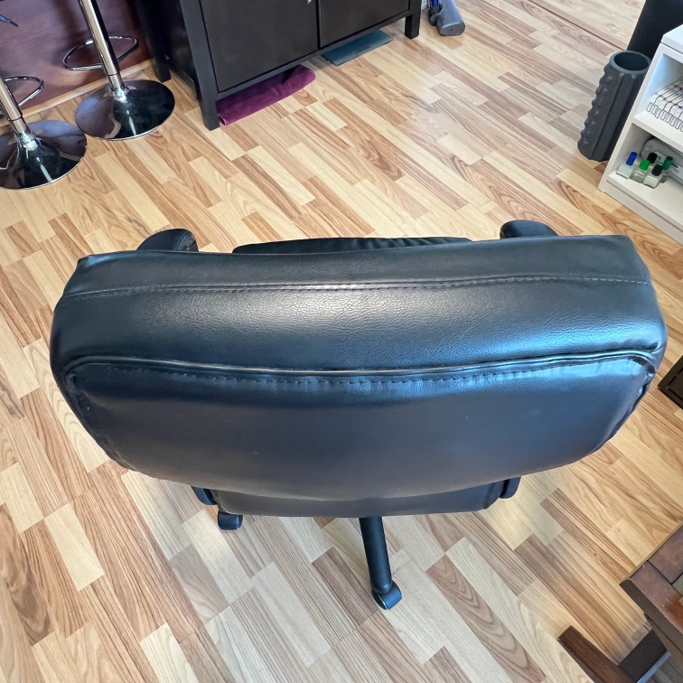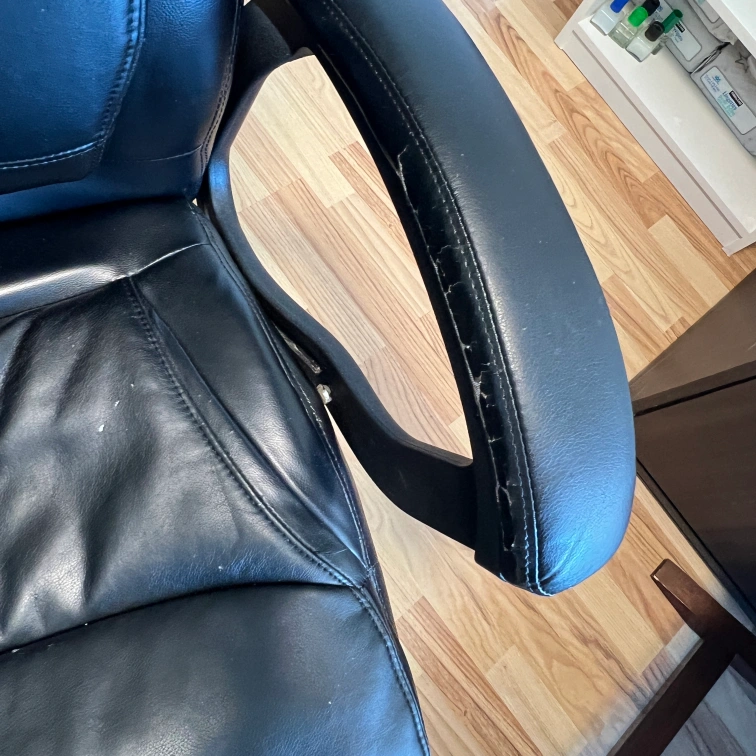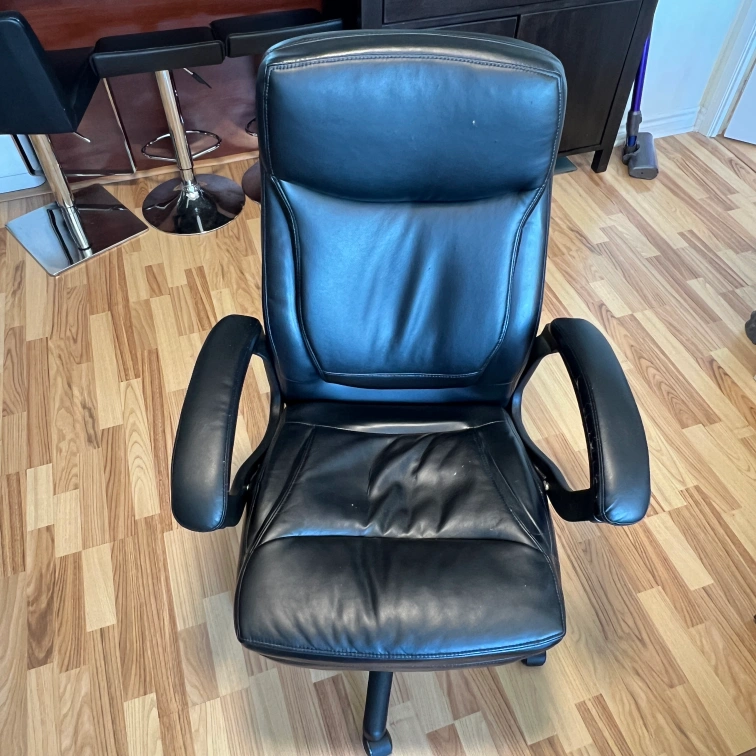 Selling a black leather office chair. It has some wear and tear, particularly on the armrests and seat, as shown in the photos. Still a comfortable and functional chair for your home office!