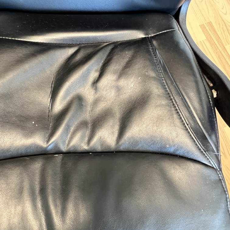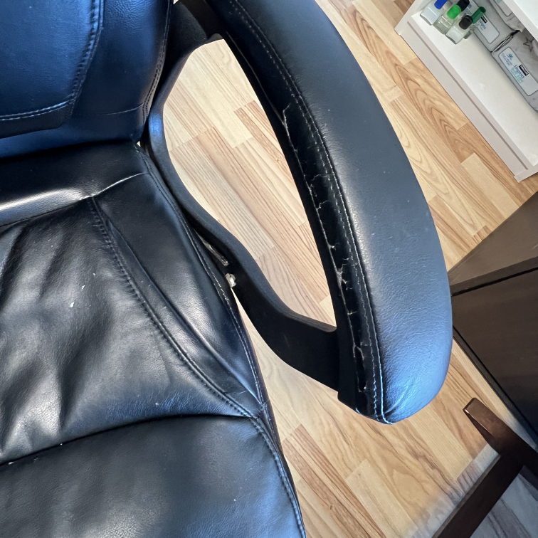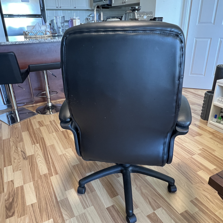 Selling a black leather office chair. It has some wear and tear, particularly on the armrests and seat, as shown in the photos. Still a comfortable and functional chair for your home office!