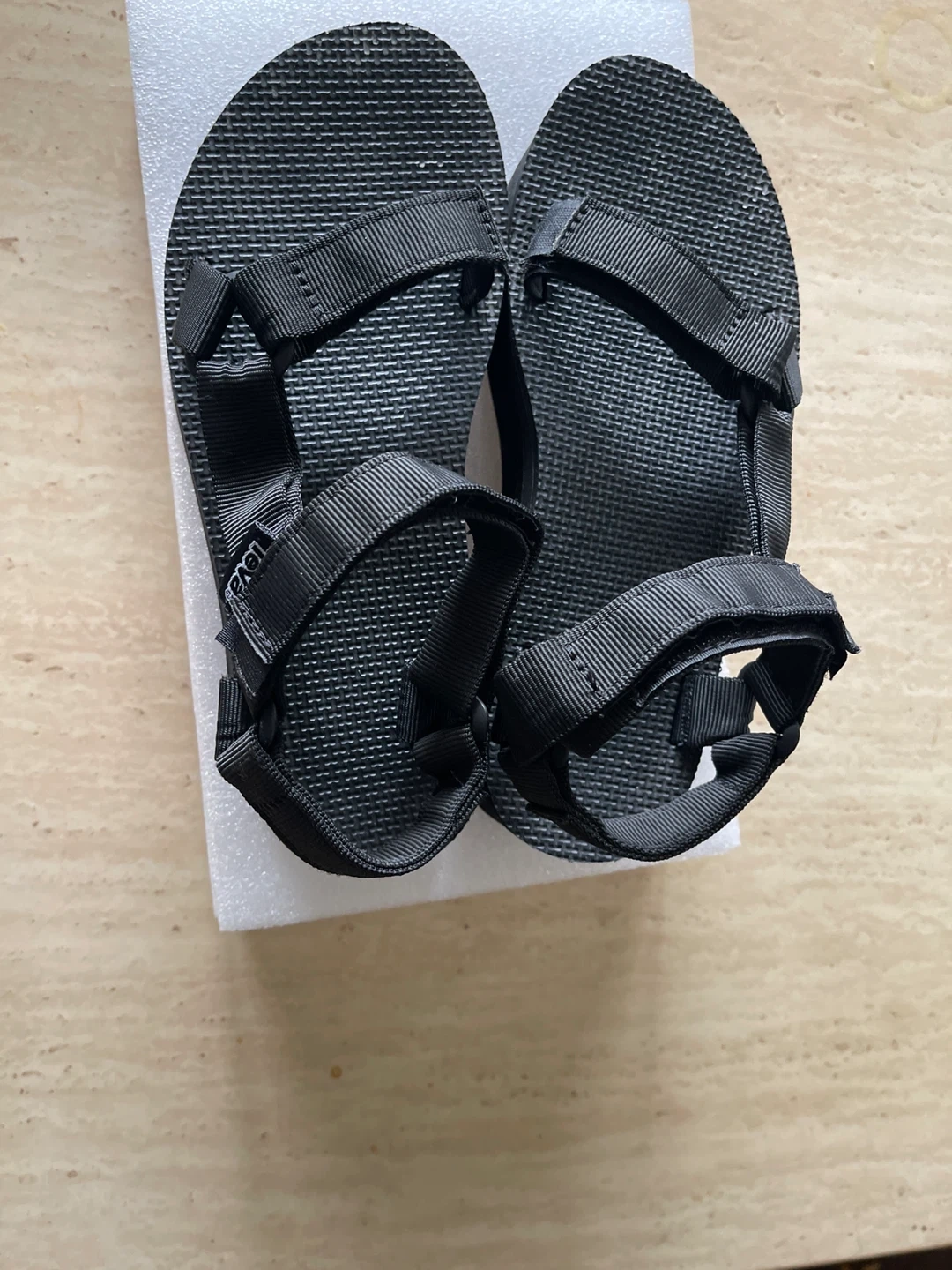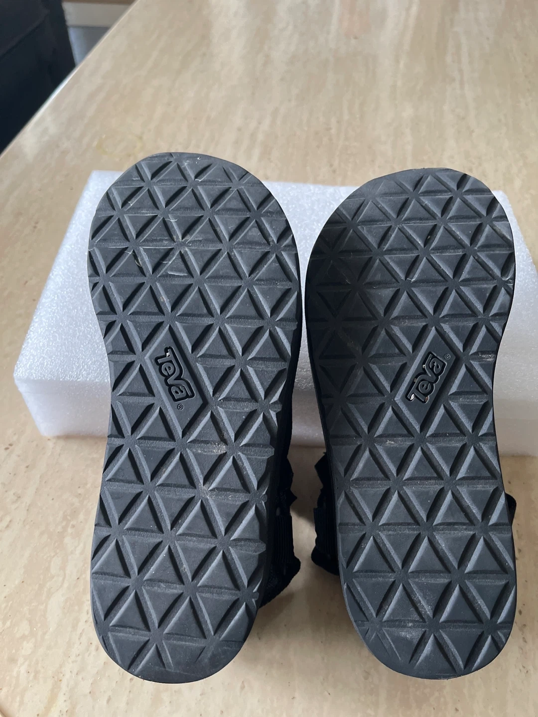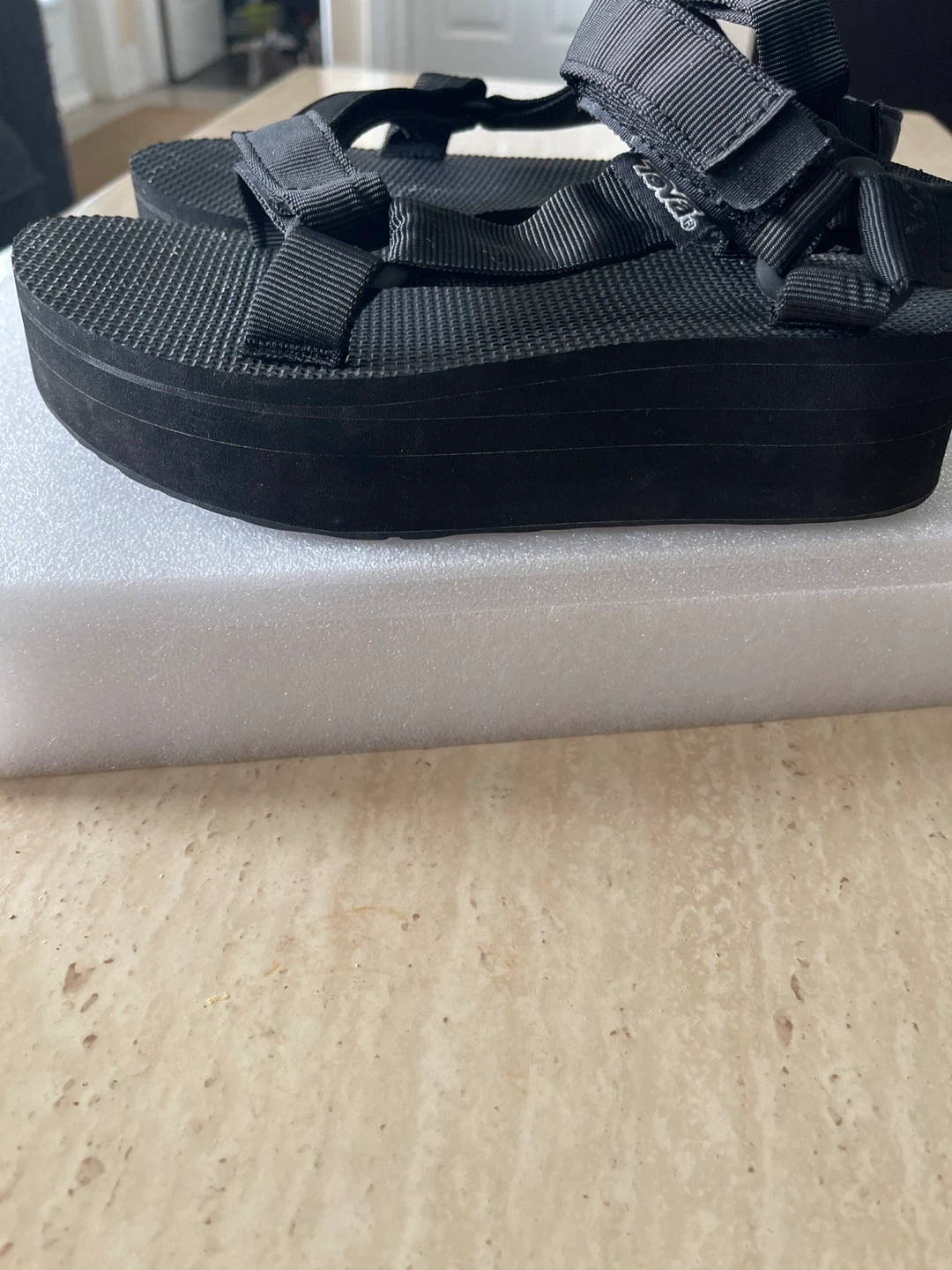 These are used black Teva platform sandals. They feature adjustable straps for a secure fit. Perfect for everyday wear!
