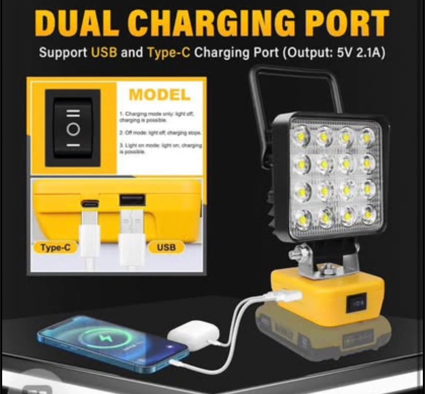 RIGIDON Cordless LED Work Light for Dewalt 18/20V Battery, 48W 4800LM Flashlight LED Flood Light with USB and Type C Charging Port Portable Outdoors Job Site Light(Without Battery)