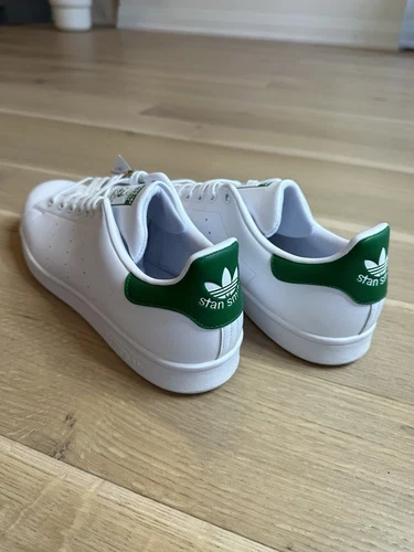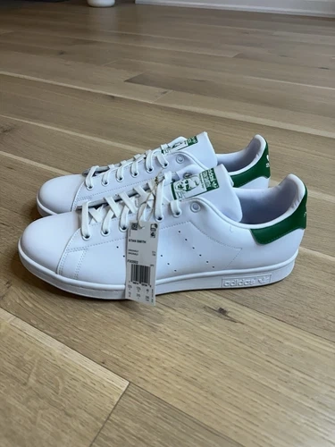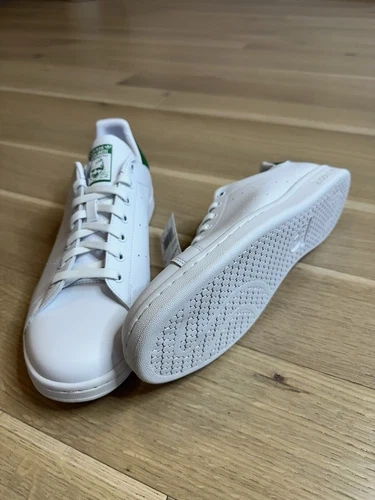 The Adidas Stan Smith Originals in white and green are a classic sneaker style for men. This pair comes in a size 13 and is brand new in the original box. The iconic Stan Smith model from Adidas is known for its timeless design and comfortable fit, making it a versatile choice for everyday wear. Whether you're a fan of athletic shoes or simply looking for a stylish sneaker option, these Adidas Stan Smiths are sure to impress with their sleek white and green colourway.