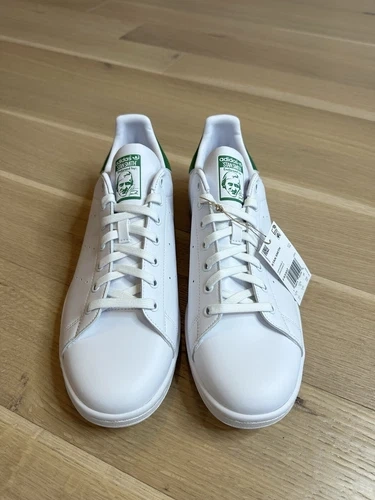 The Adidas Stan Smith Originals in white and green are a classic sneaker style for men. This pair comes in a size 13 and is brand new in the original box. The iconic Stan Smith model from Adidas is known for its timeless design and comfortable fit, making it a versatile choice for everyday wear. Whether you're a fan of athletic shoes or simply looking for a stylish sneaker option, these Adidas Stan Smiths are sure to impress with their sleek white and green colourway.