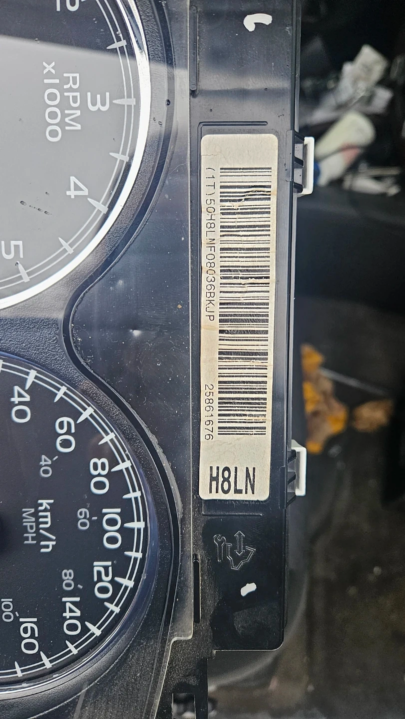 This is a used instrument cluster gauge speedometer. It displays RPM, Speed in km/h and mph, fuel level, and temperature. Part number H8LN is visible on the label.