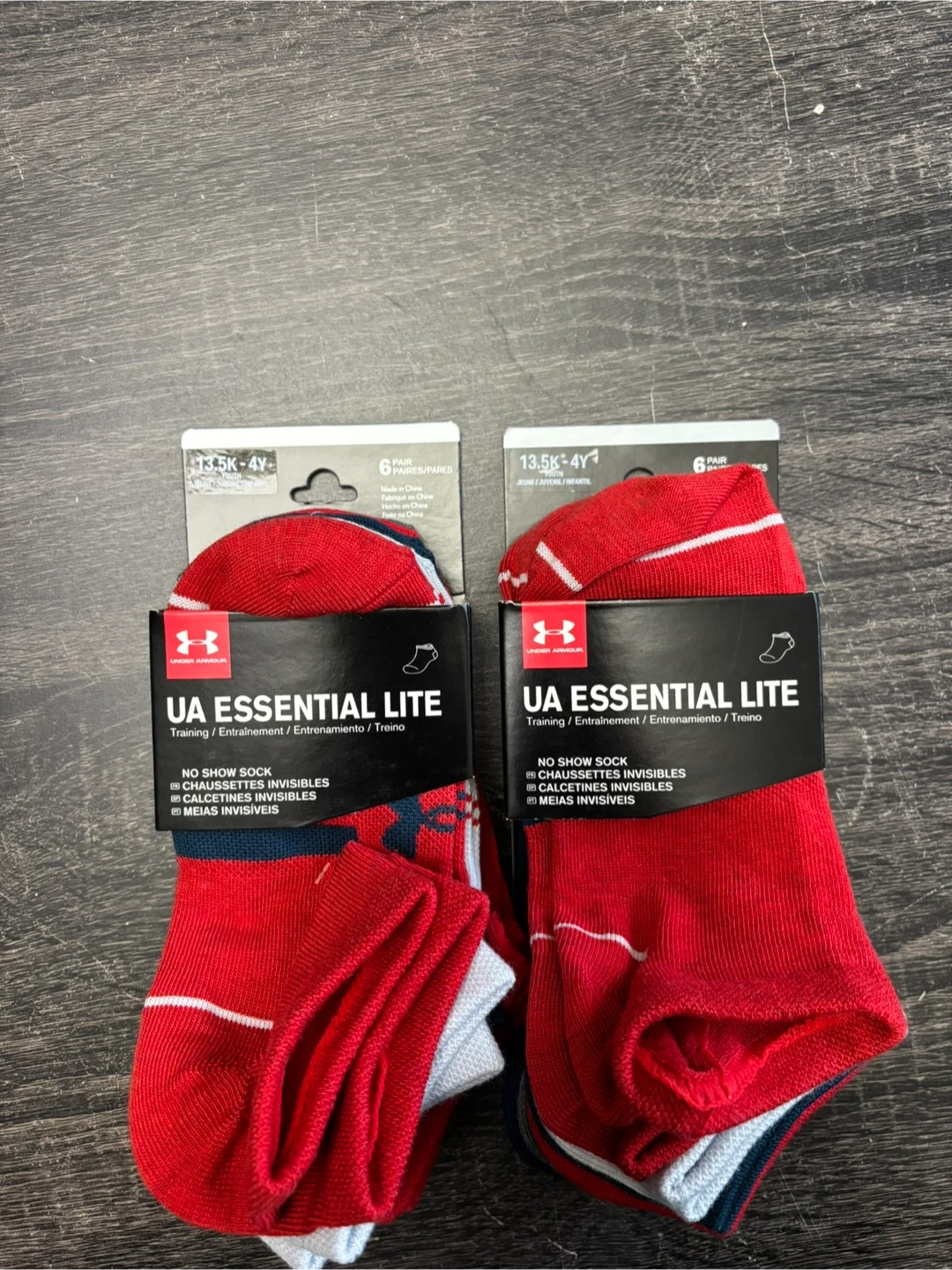 This is a 6-pair pack of Under Armour UA Essential Lite No Show socks in red. They are made with Flat Knit Construction for superior touch and feel. Material wicks moisture. Available in sizes 13.5K-4Y.