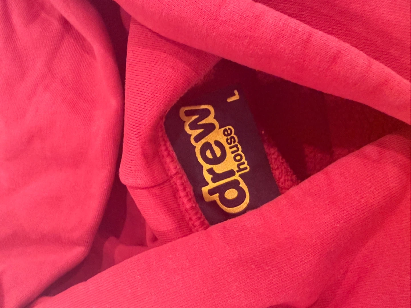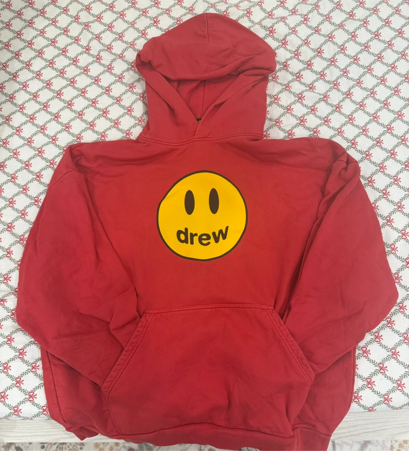 Selling a Drew House hoodie in red, size large. It features the iconic yellow smiley face logo on the front. Great for adding a pop of colour to your wardrobe!