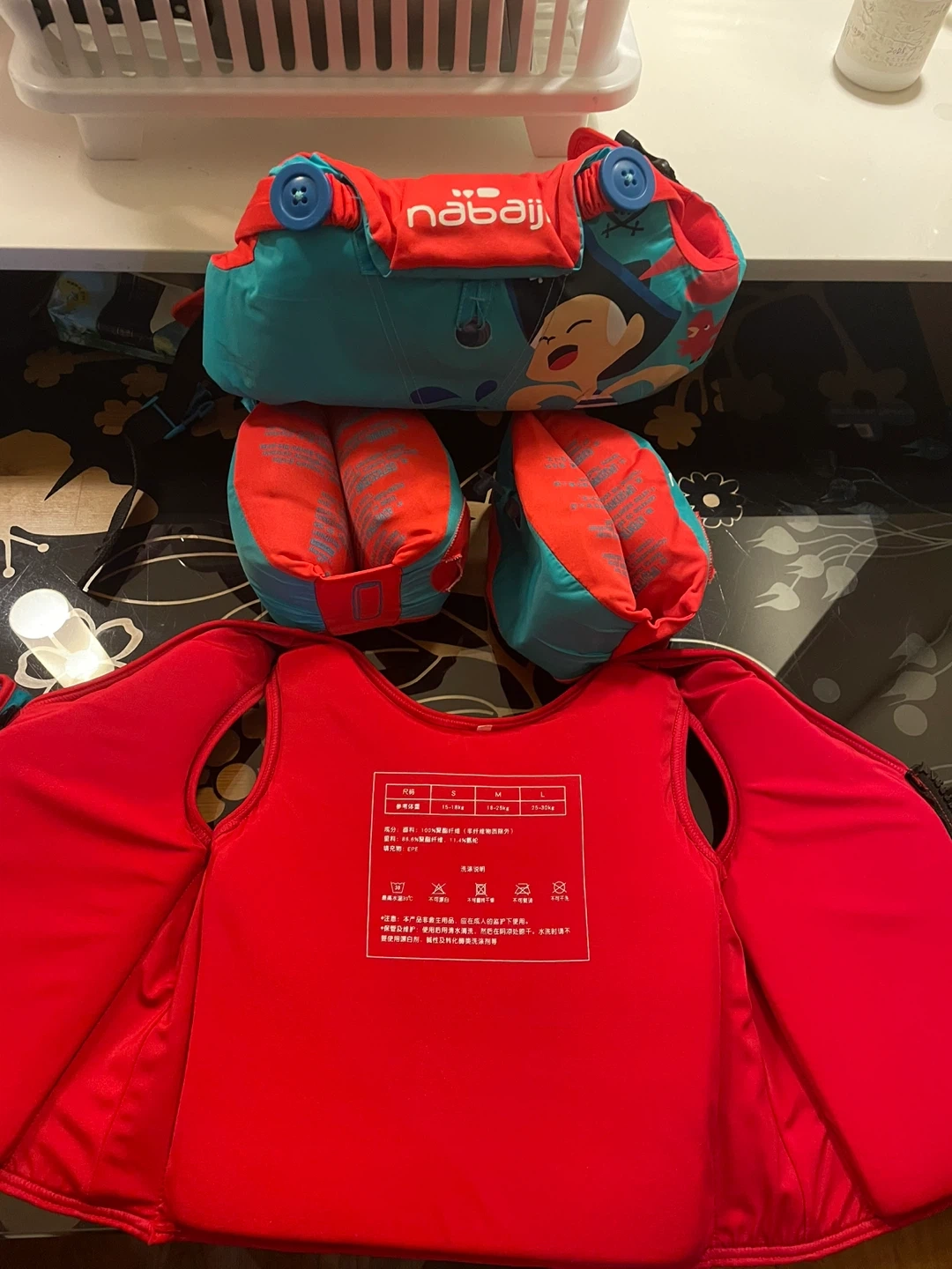 This Nabaiji swim vest comes in a bright teal and red with a cool Marvel Captain America design. It's made for kids and features adjustable straps for a secure fit. The vest is designed for children weighing between 15-30kg. It's perfect for helping young swimmers gain confidence in the water!