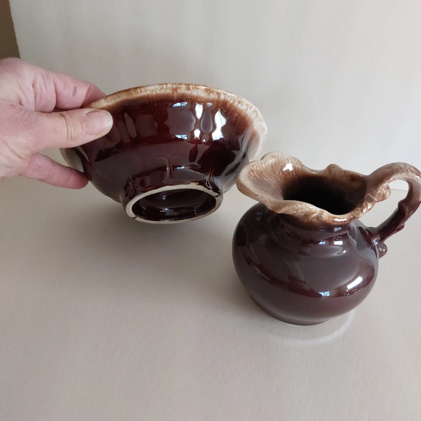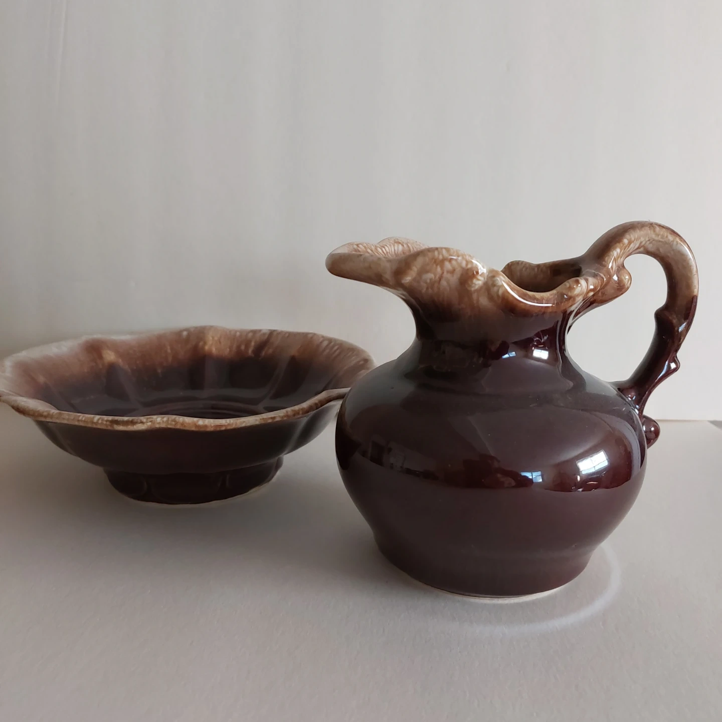 This set includes a shiny brown ceramic pitcher and a matching bowl. Both pieces have a decorative fluted rim. Great for serving or as a decorative accent!