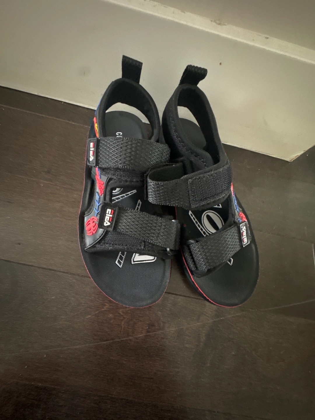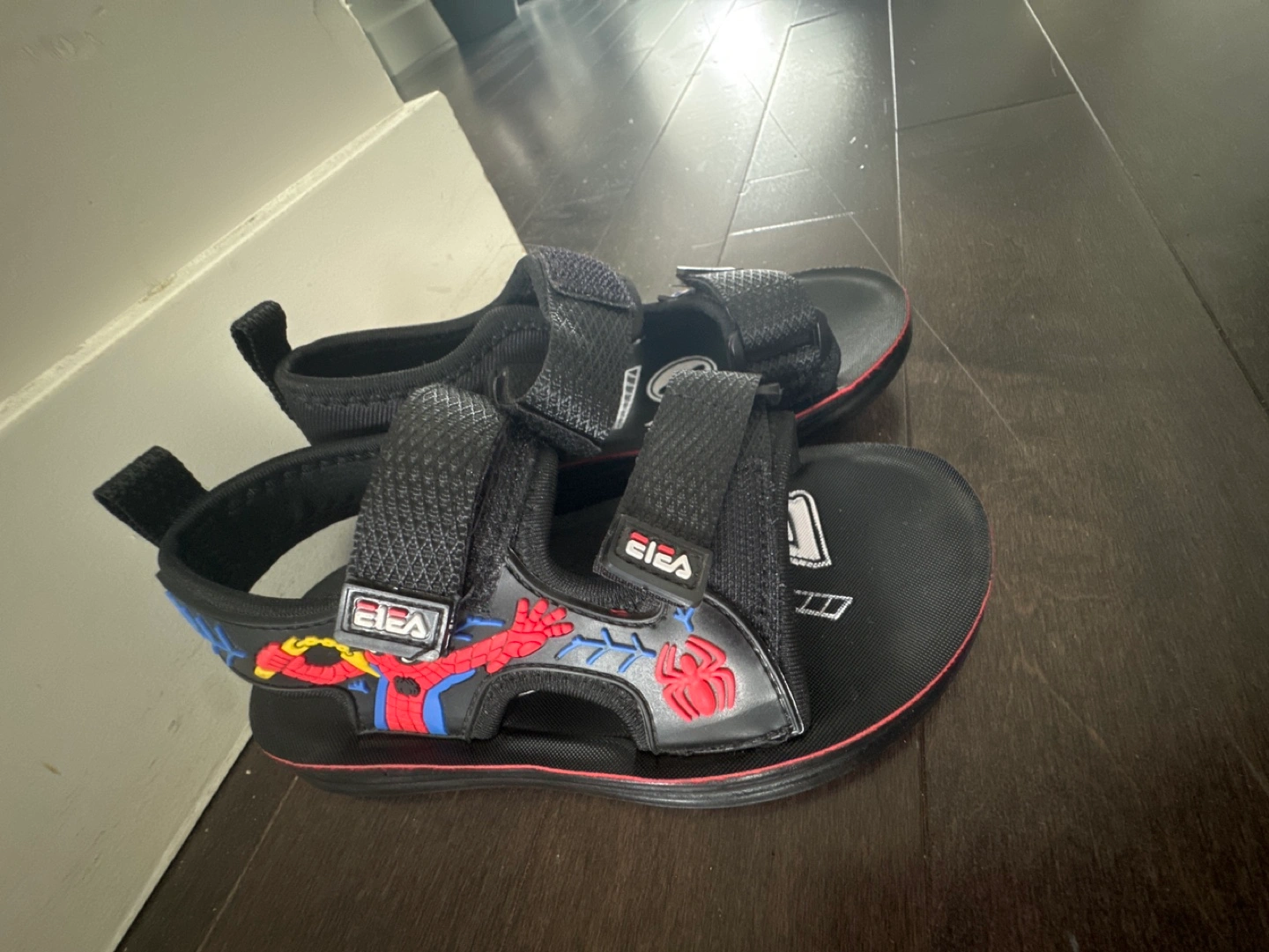 Three pairs of kids' sandals. One pair black with Spiderman, one pair black with blue accents, and one pair white with black soles. 3 for 15 sizes on the back of the shoes