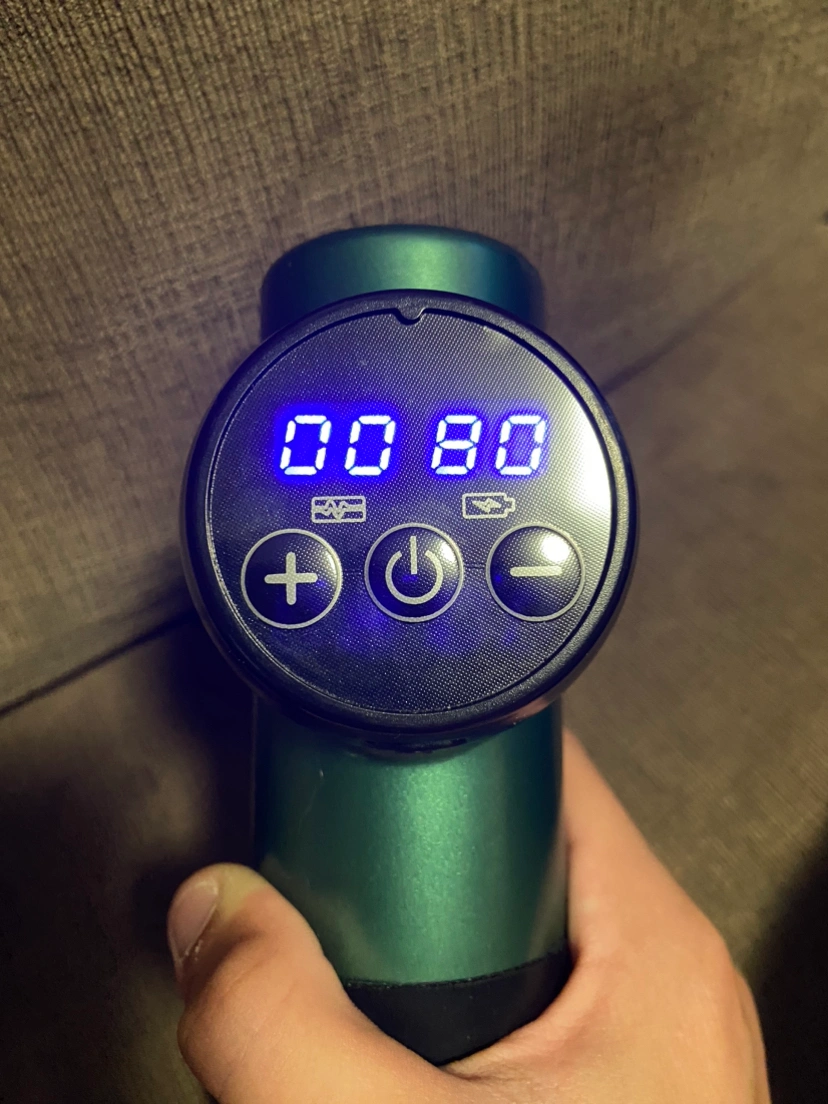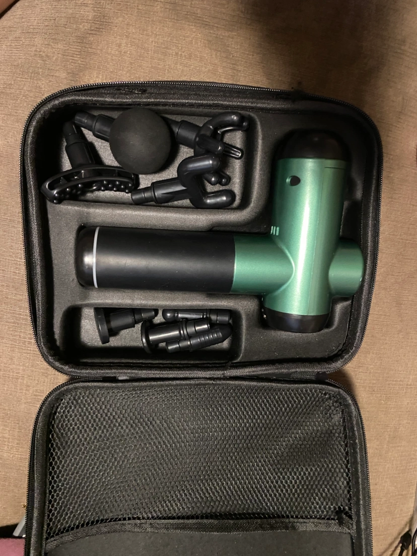 Massage Gun used like new comes with different attachments, power modes from 1 all the way to 100 comes with fast charger and the battery life is really long