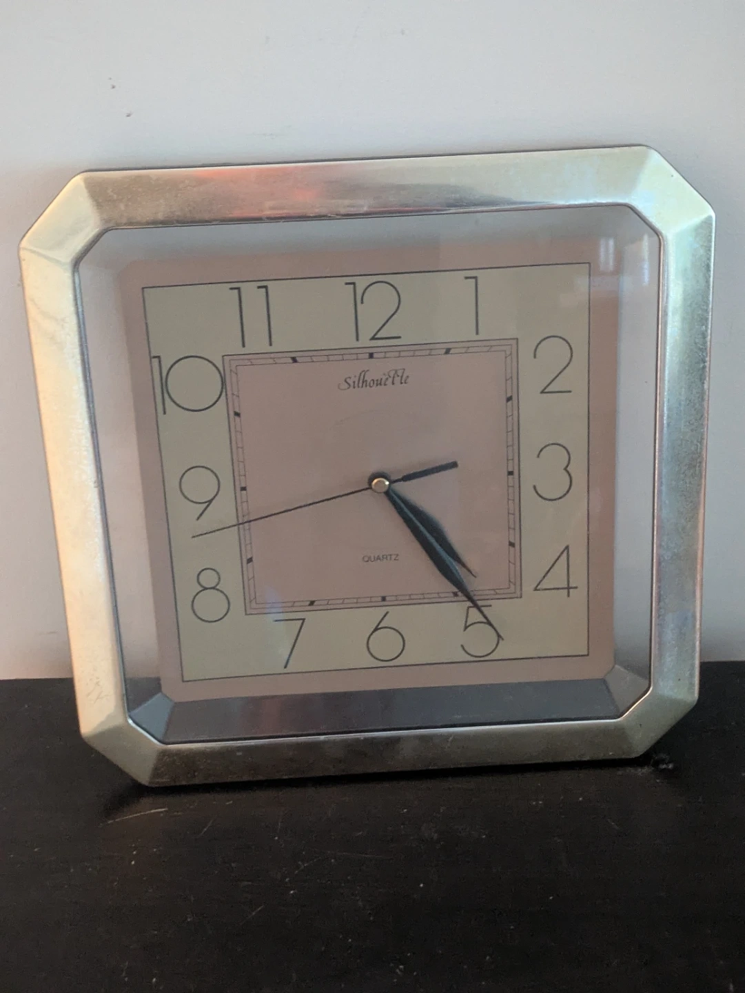This is a Silhouette quartz clock. It has a silver-toned metal frame and a light beige face with black hour markers. The clock is powered by a quartz movement.