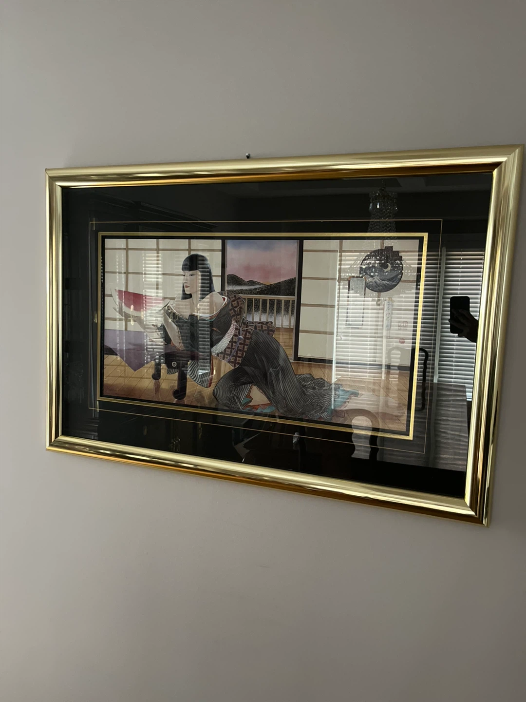 Beautiful framed art print featuring a Japanese woman in traditional dress. The frame is a shiny gold colour and in good condition. It would look lovely in any room of the house!