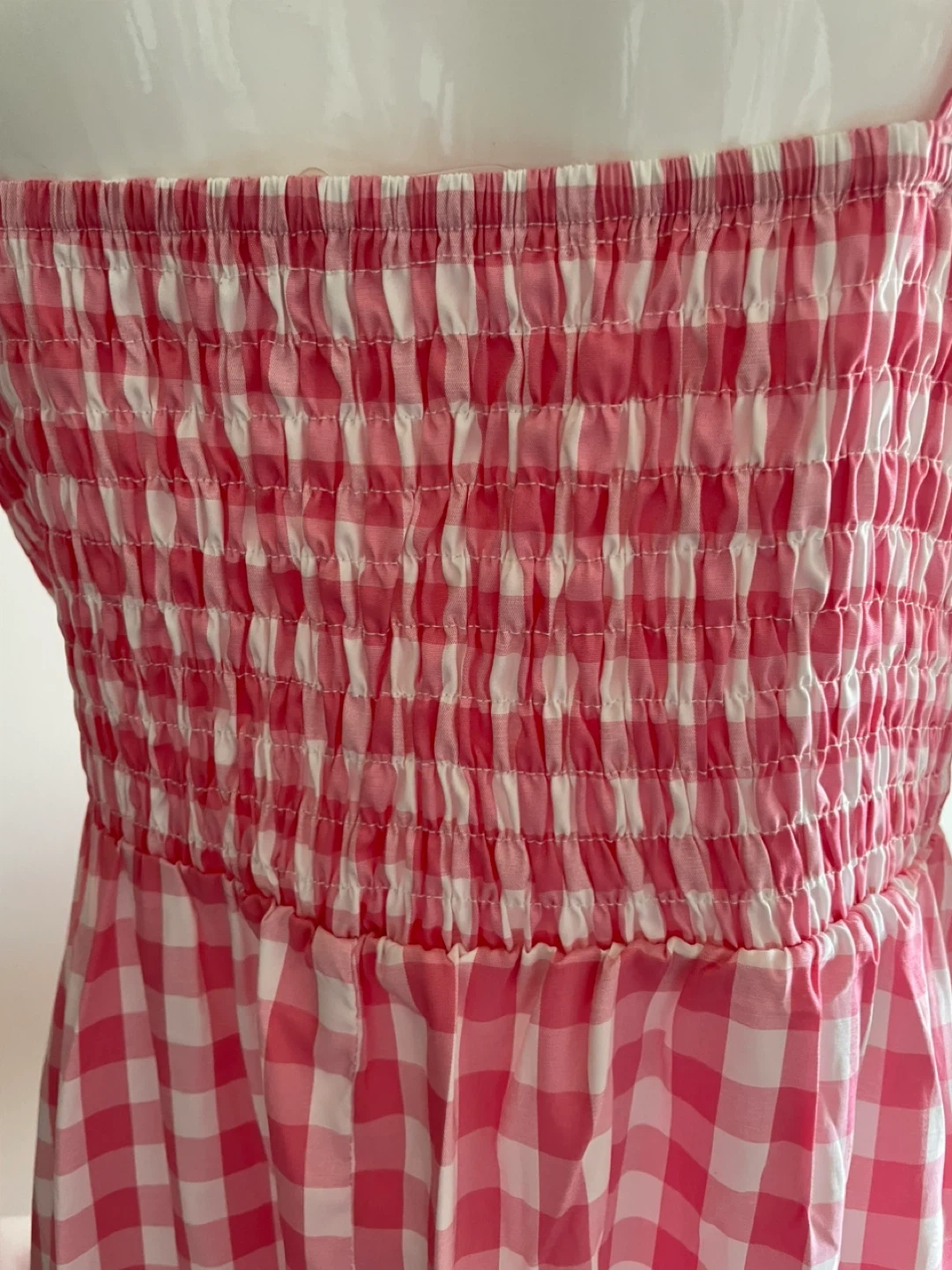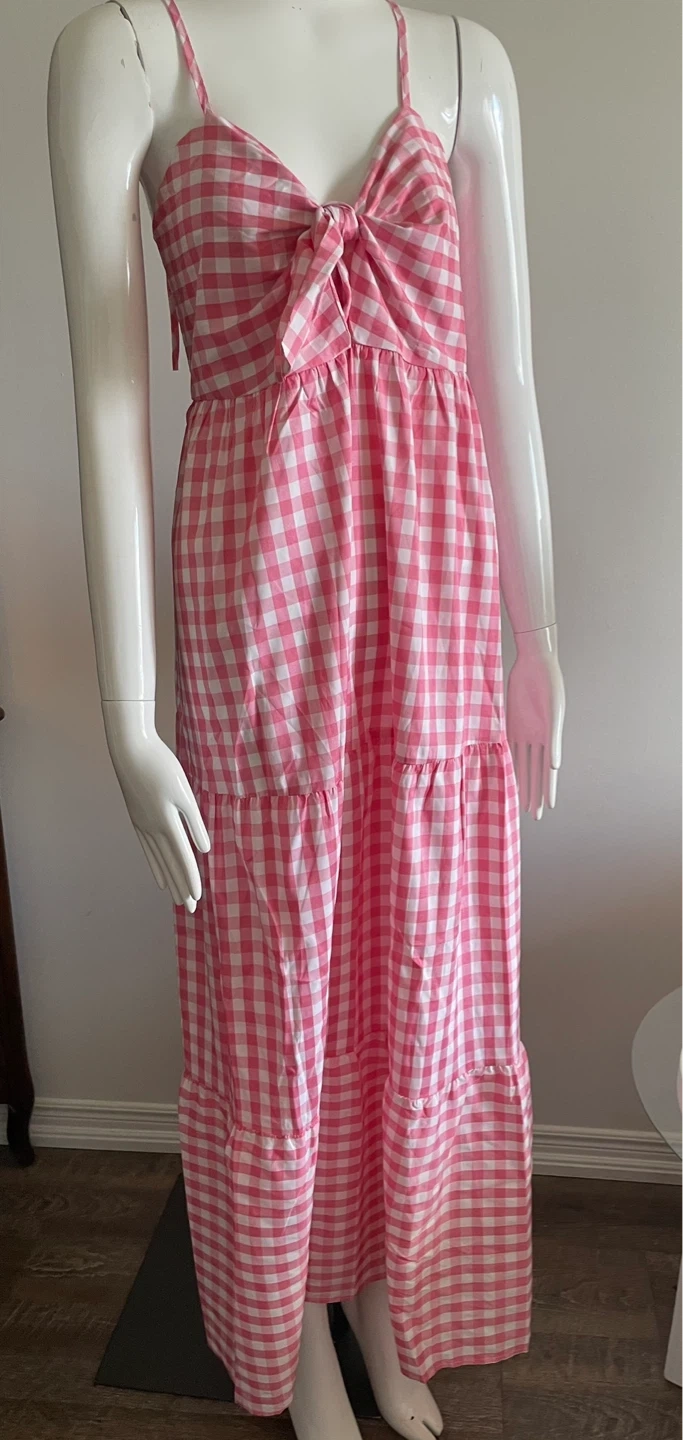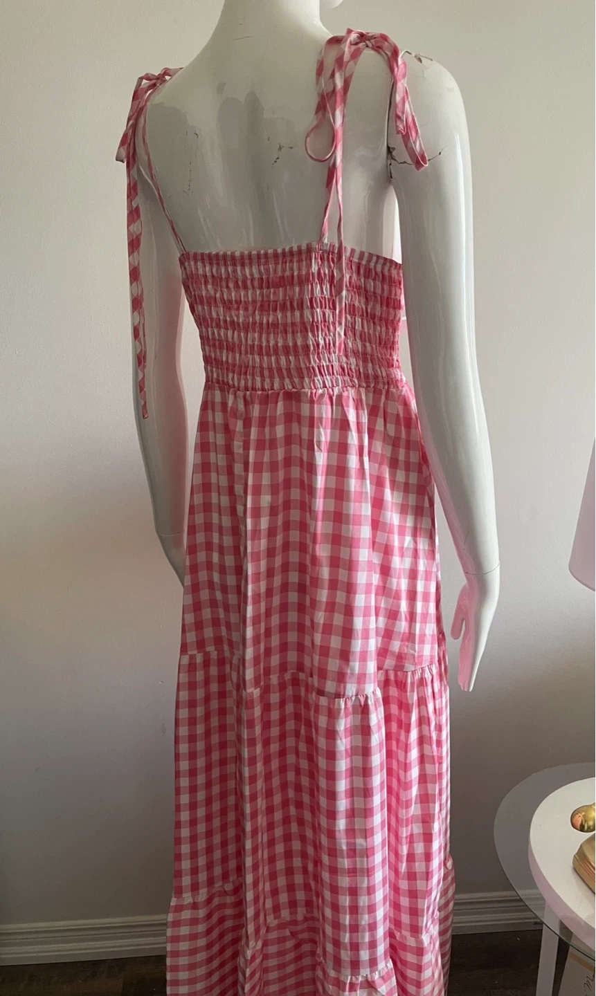 A cute pink and white gingham maxi dress. It features a smocked bodice and tie straps. The tiered skirt adds a flowy silhouette.