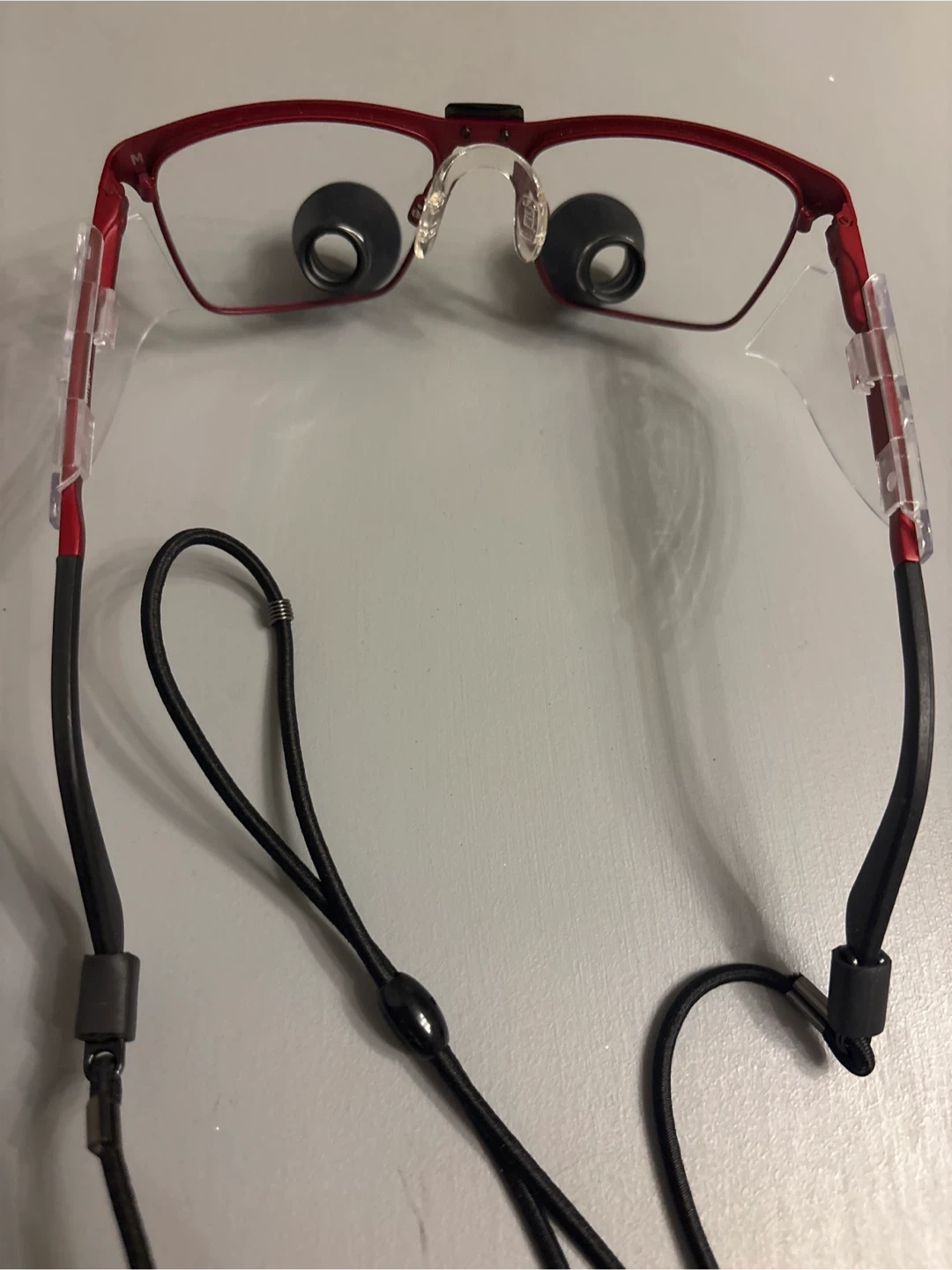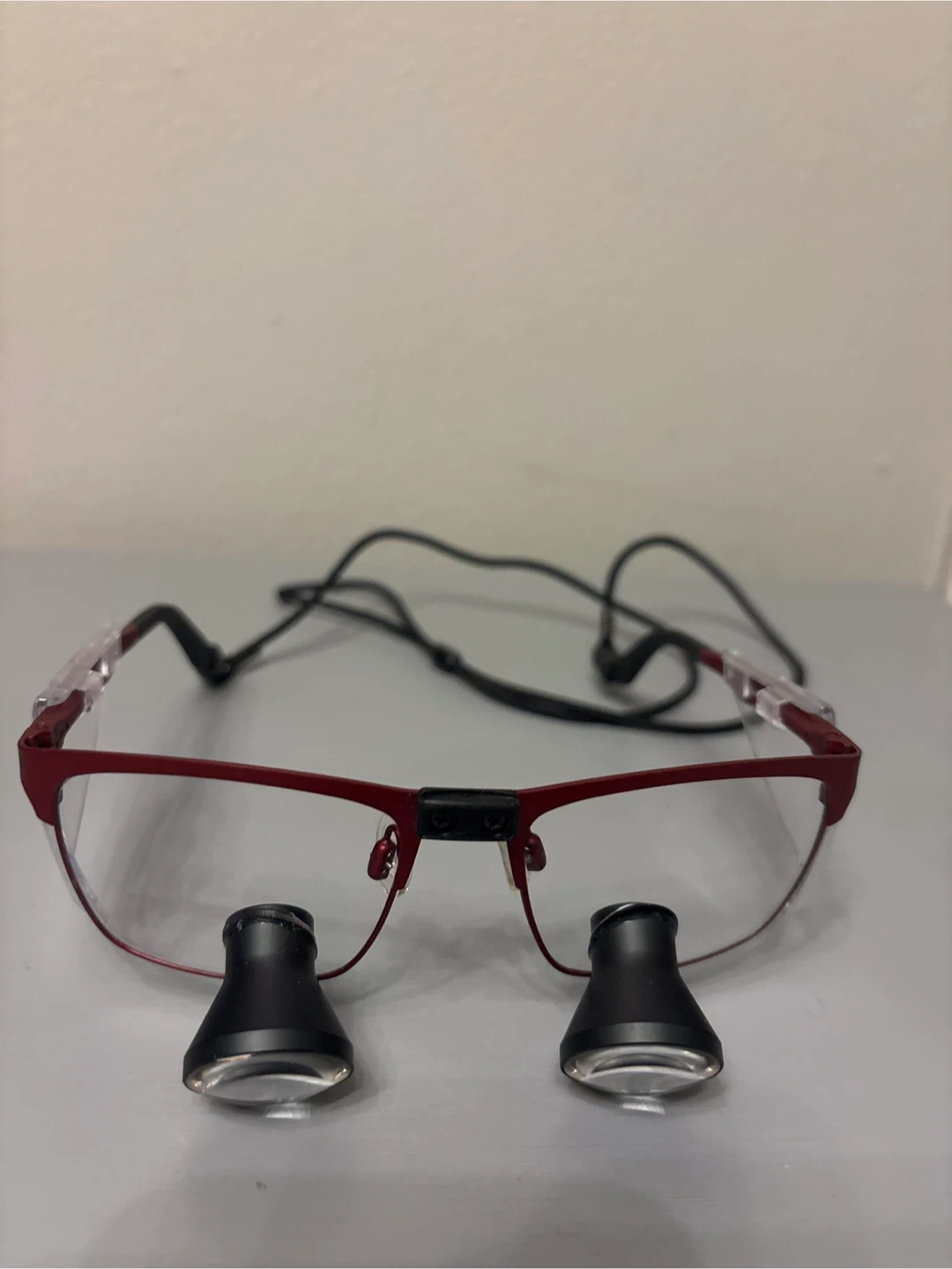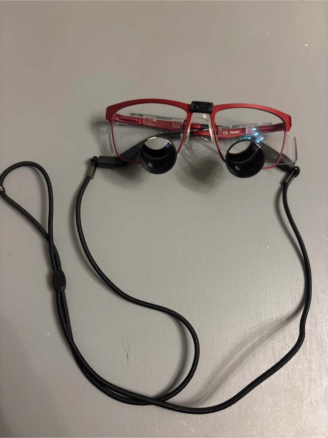 Selling a pair of Orascoptic Tempo 2.5X magnifying glasses/Loupes with a red frame! They come with a black neck strap.