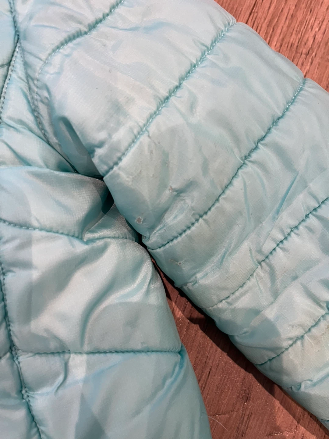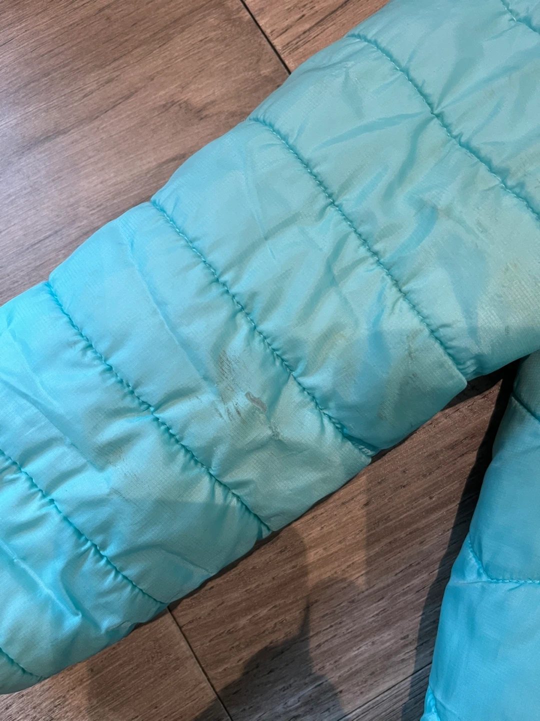 Selling girls, Eddie Bauer, jacket in light blue. It has some stains on the sleeve. Great for keeping your little one warm and cozy! Faux fur lined……size 6
