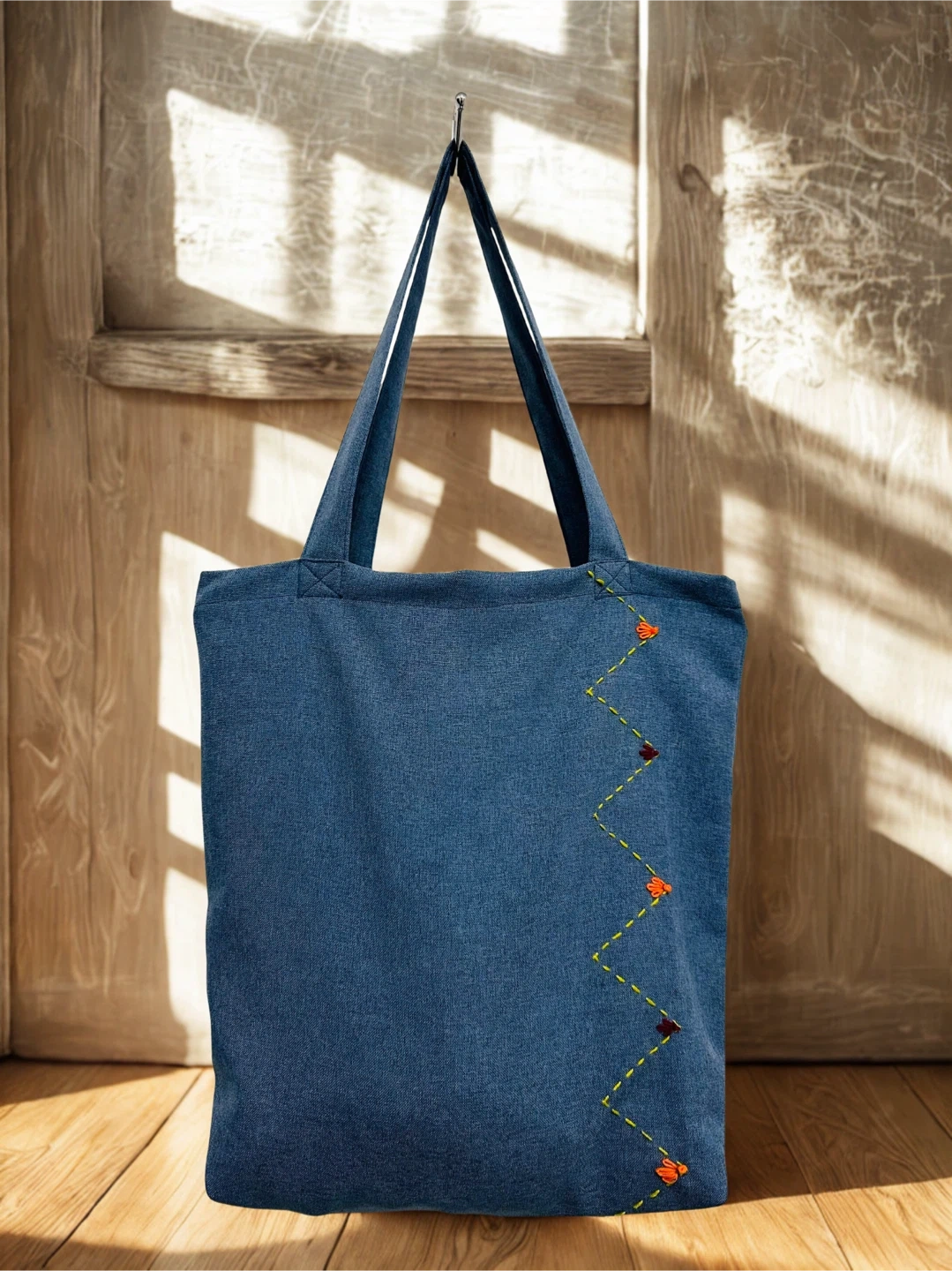 A cute blue denim tote bag! It features a unique embroidered design with a zig-zag pattern and little flower accents. Perfect for carrying your everyday essentials in style