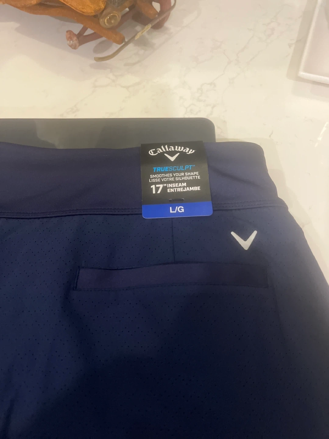 Callaway Truesculpt golf skort in size Large. It's a navy blue colour with a 17-inch inseam. The material is moisture-wicking and has some stretch to it. Perfect for the golf course!