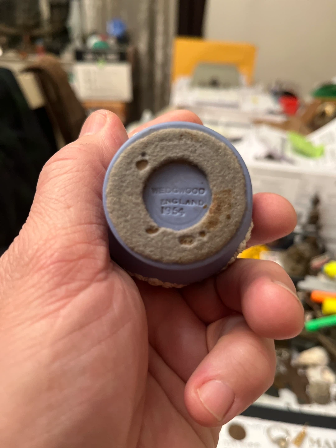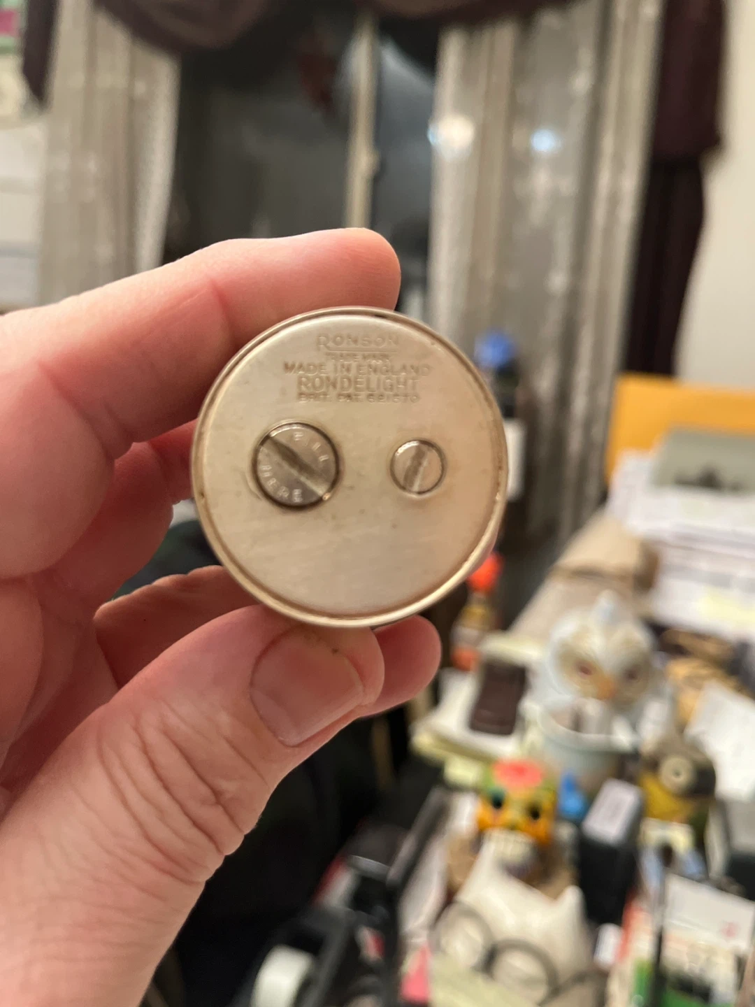Vintage Ronson Rondelight lighter. Made in England. Features a gold-tone top and a blue jasperware-style base with decorative white relief. Comes in its original box. A classic collectible lighter!