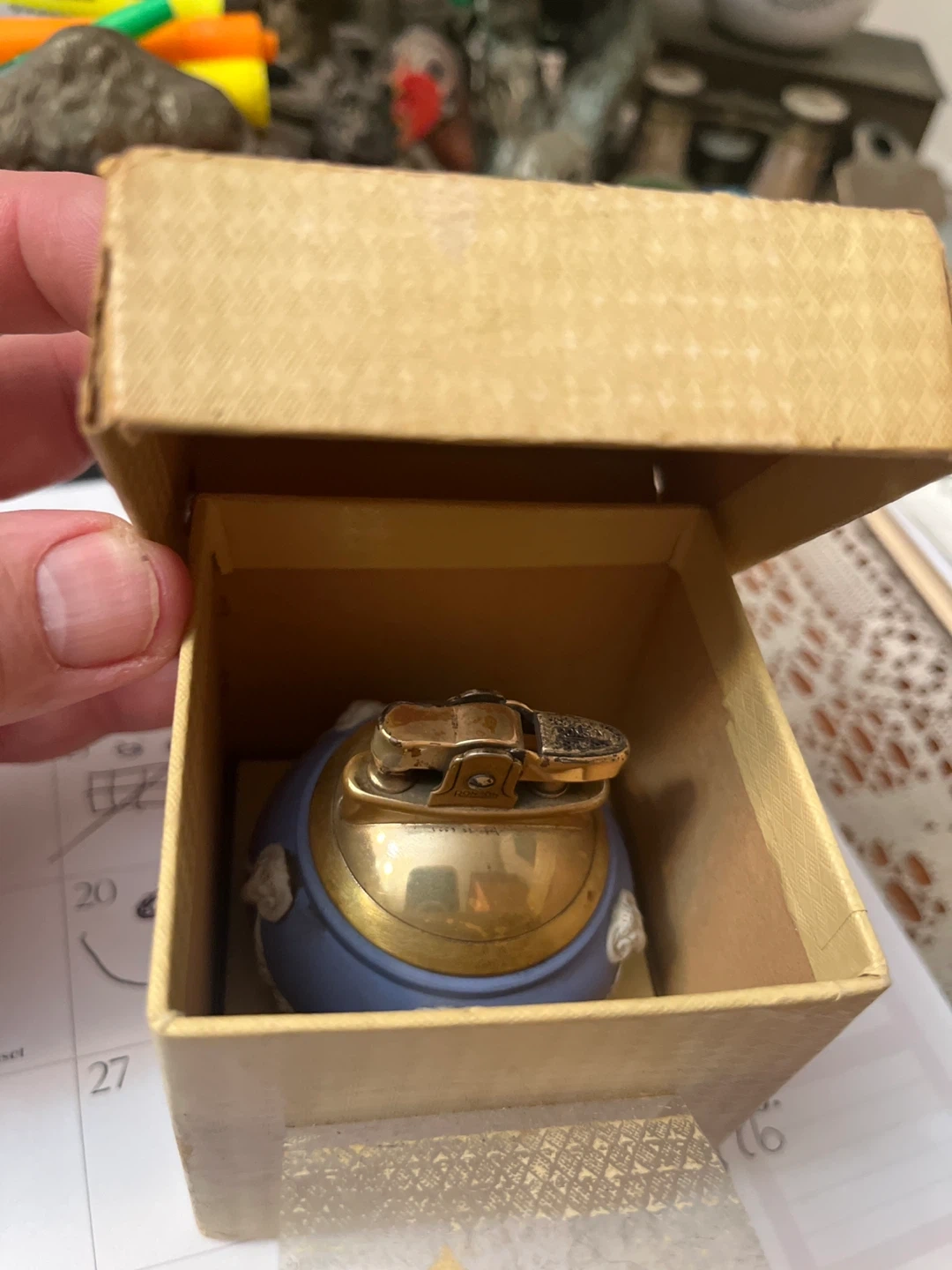 Vintage Ronson Rondelight lighter. Made in England. Features a gold-tone top and a blue jasperware-style base with decorative white relief. Comes in its original box. A classic collectible lighter!