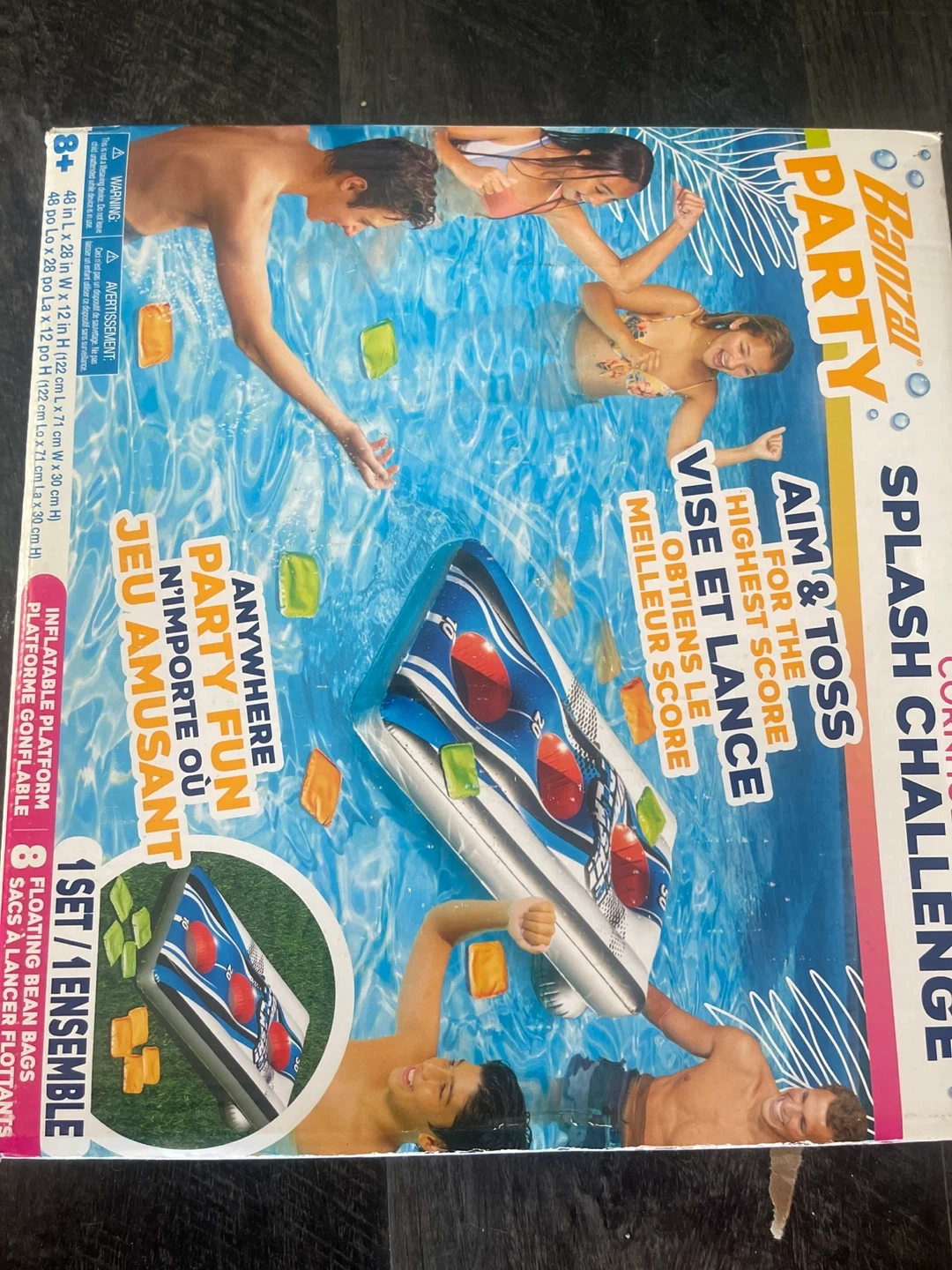 This Banzai Party Splash Challenge inflatable platform is for aim and toss fun. It comes with 8 floating bean bags. Ages 8 and up.