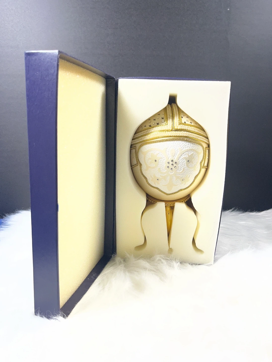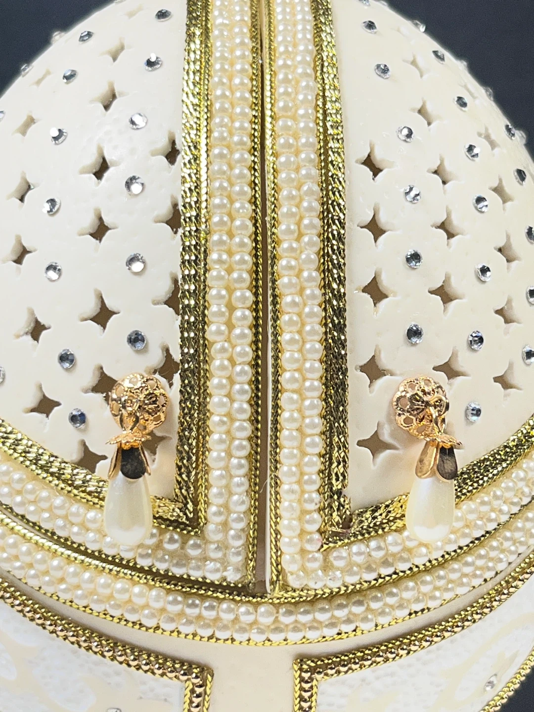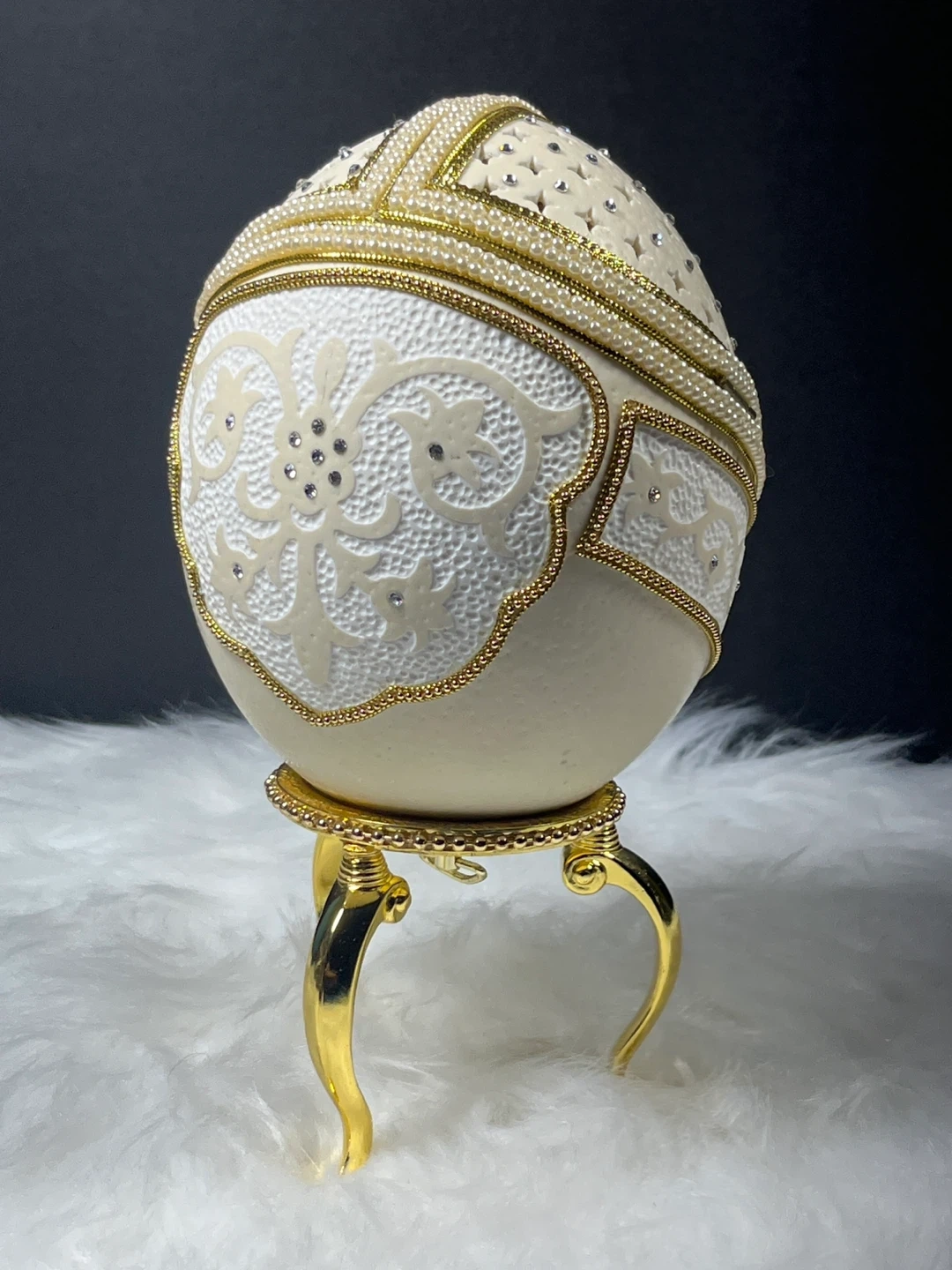 This ornate object is an Astoria Grand Ostrich Egg Musical Jewellery Box. Handcrafted from an authentic eggshell, it features intricate gold trim, pearl accents, and a lattice-work top with star-shaped cutouts.