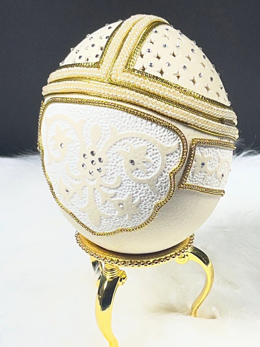 The box is set on a decorative gold-toned stand and often serves a dual purpose as both a jewelry container and a music box; common versions of this model play the tune "I Just Called to Say I Love You". These designs are inspired by the opulent style of Fabergé eggs, which were historically created as extravagant gifts for the Russian royal family.