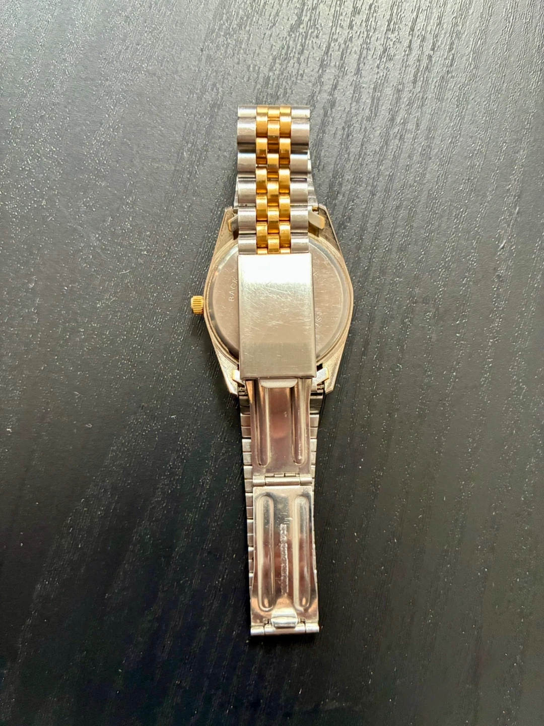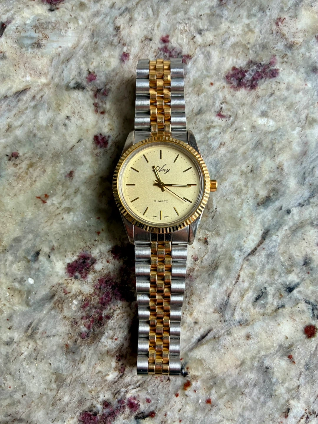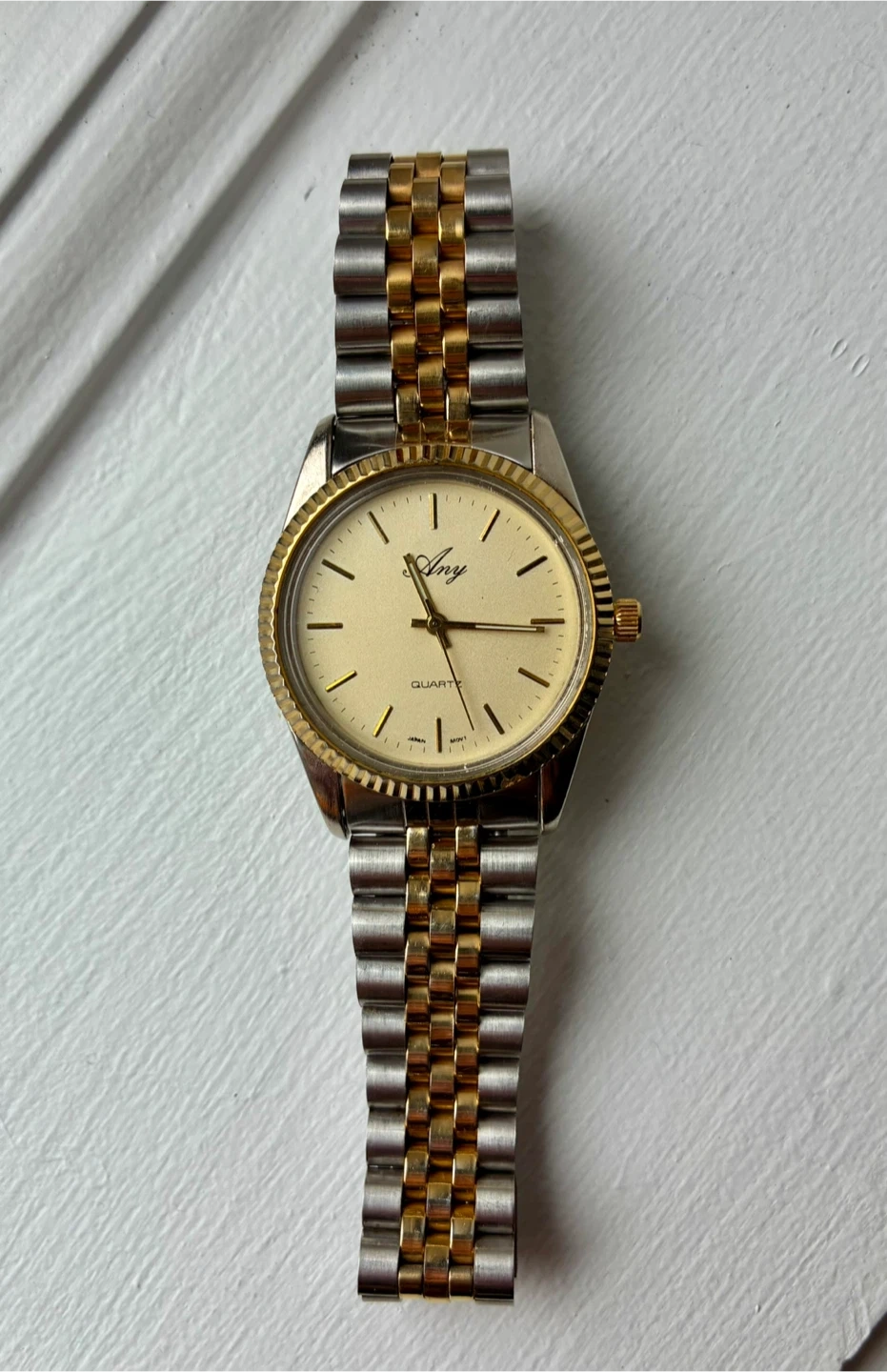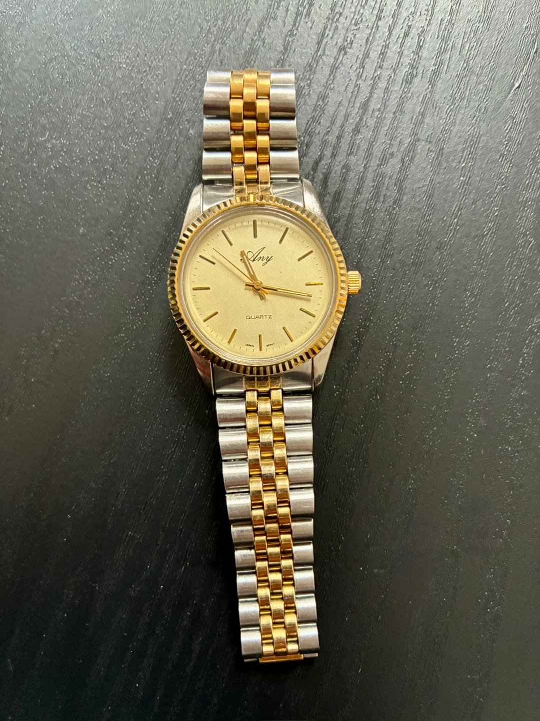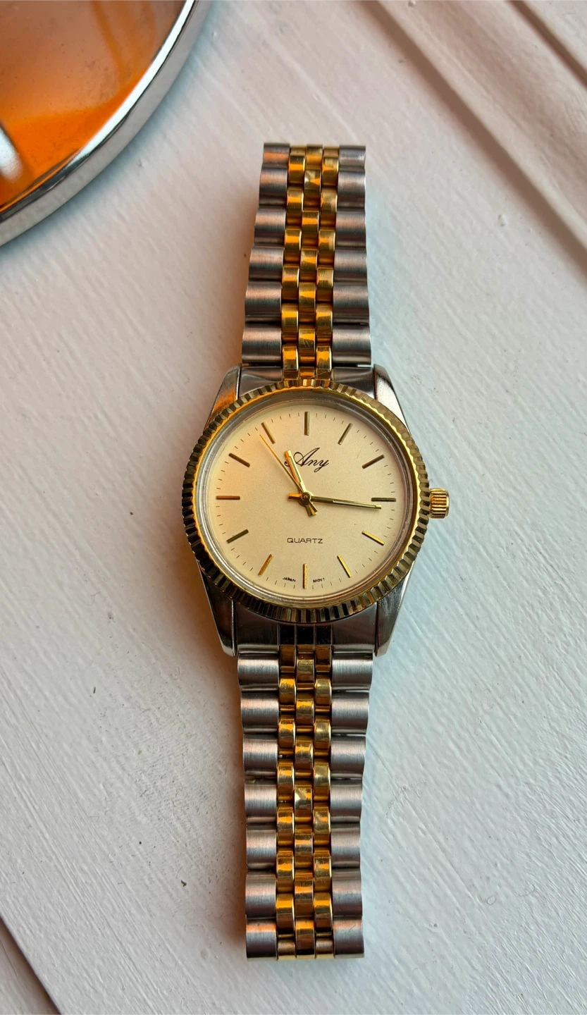 A classic quartz watch with a two-tone stainless steel band. It features a gold-tone bezel and a cream-colored dial. This watch is powered by a Japanese quartz movement.