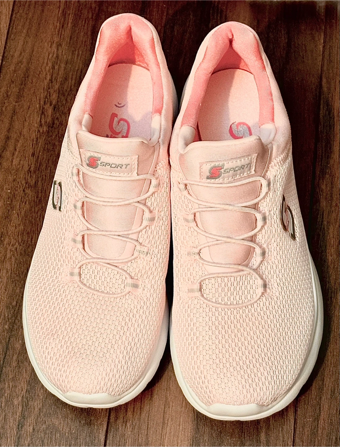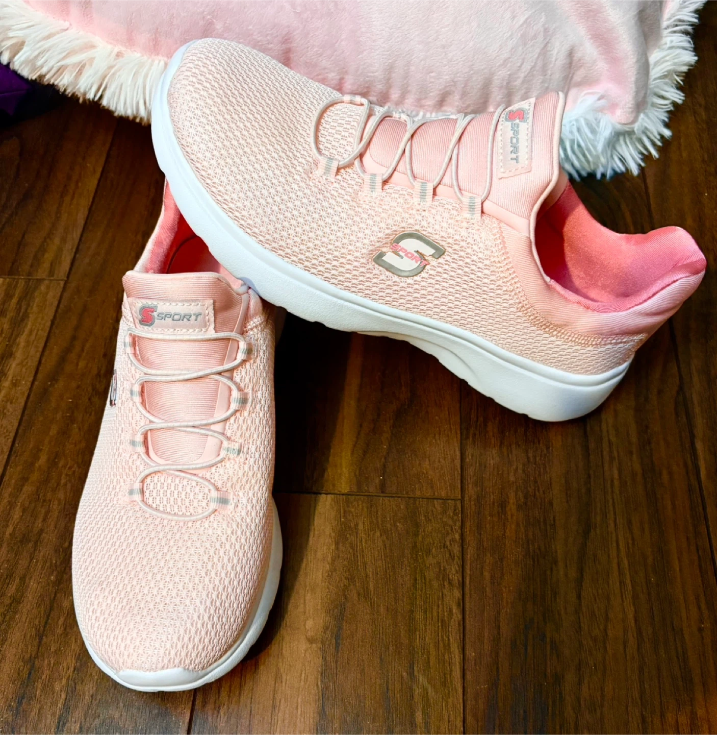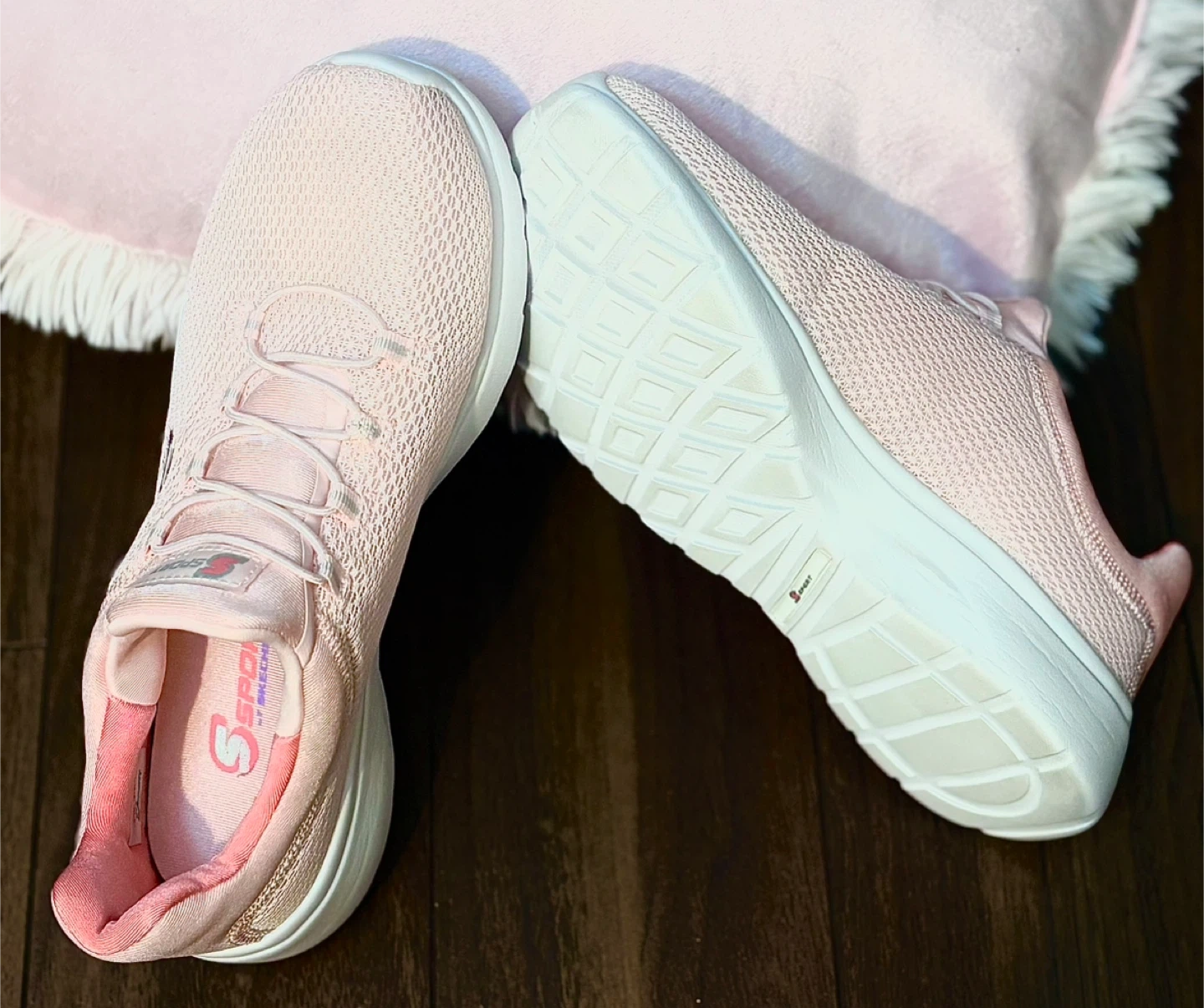 These Skechers sneakers are a soft pink colour with white soles.The shoes are lightweight and comfortable. Size 8.