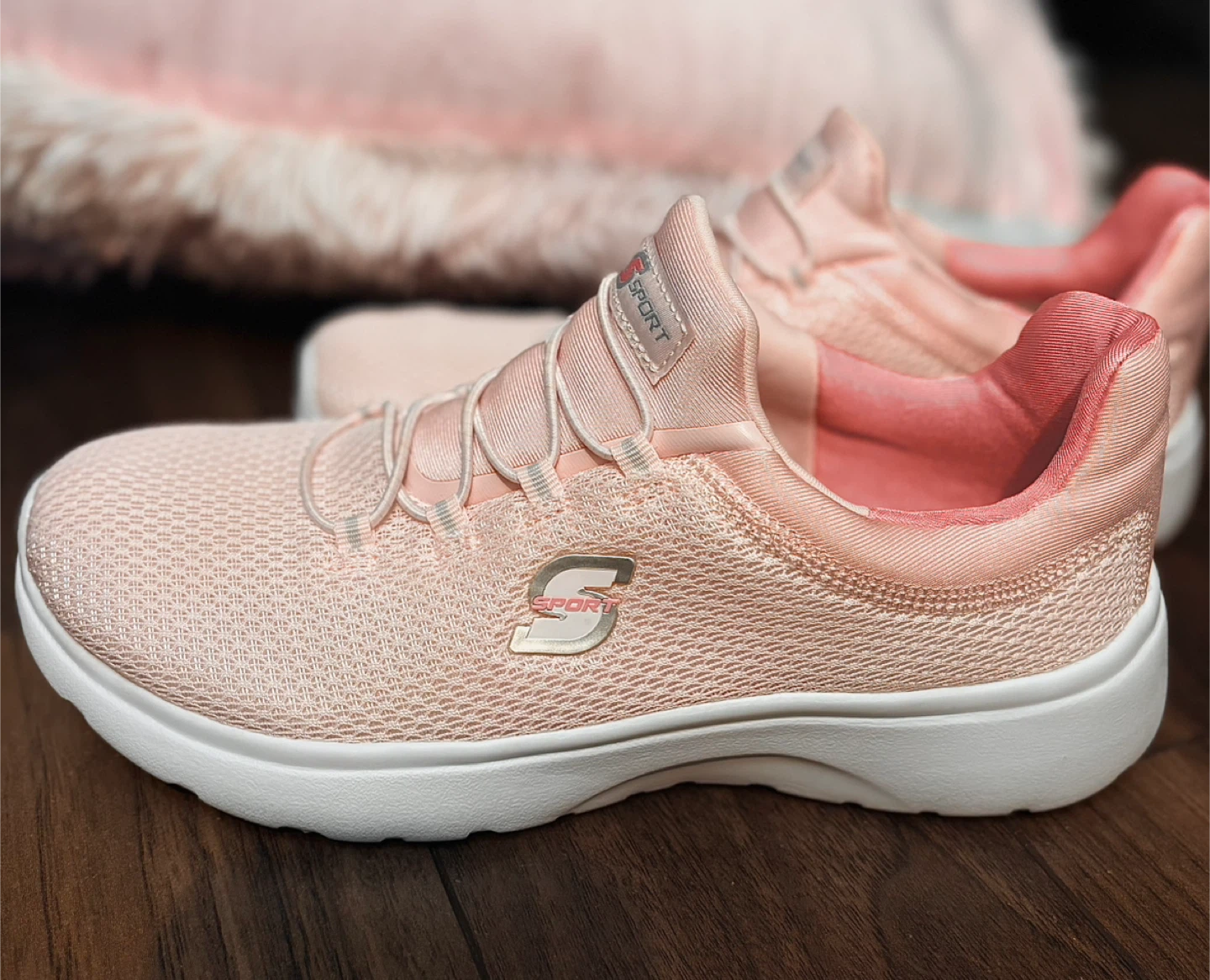 These Skechers sneakers are a soft pink colour with white soles.The shoes are lightweight and comfortable. Size 8.
