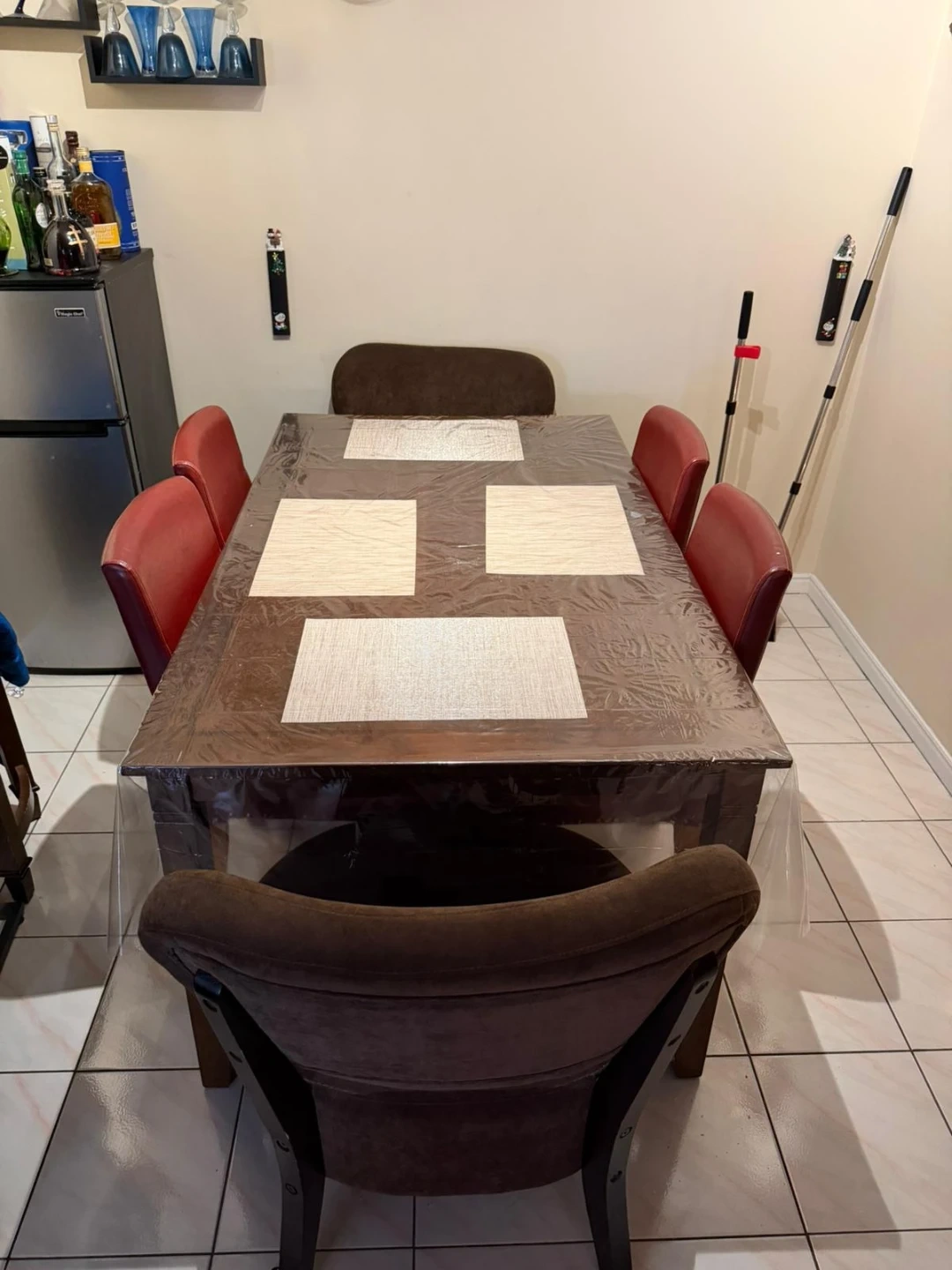 A sturdy dining table with six chairs. The table is dark wood with a clear protective plastic cover. It comes with four red upholstered chairs and two brown upholstered chairs. This set is perfect for family dinners!