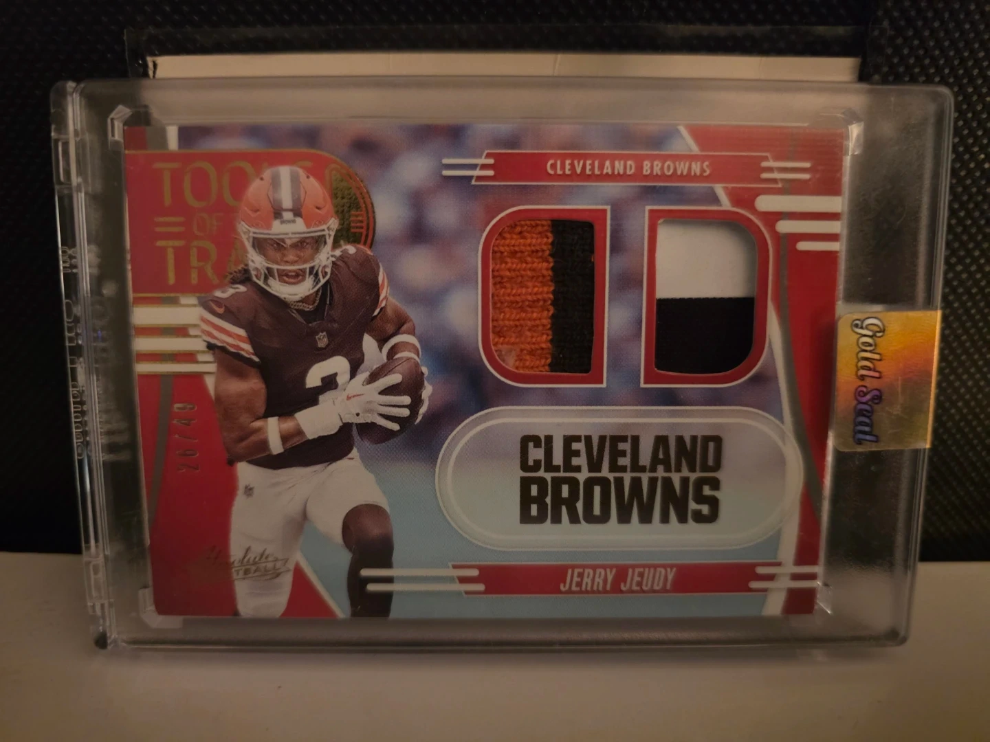 This is a 2023 Absolute Jerry Jeudy football card for the Cleveland Browns. It's a dual patch card numbered 26 out of 49. It features two patches and the player's name.