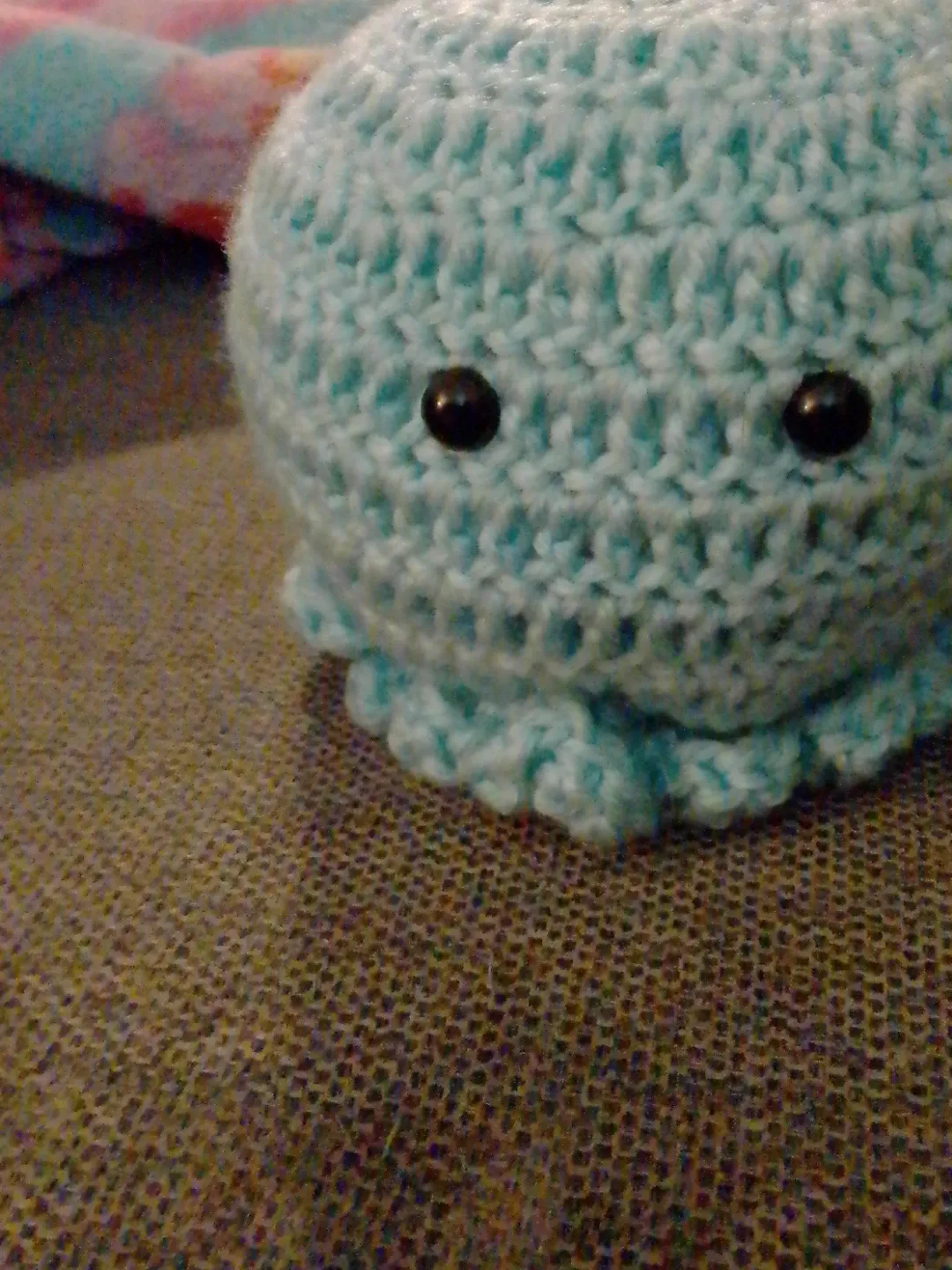 This is a cute, handmade crochet octopus plush toy. It's soft and squishy with two black button eyes. It's a lovely light blue colour, perfect for snuggling!