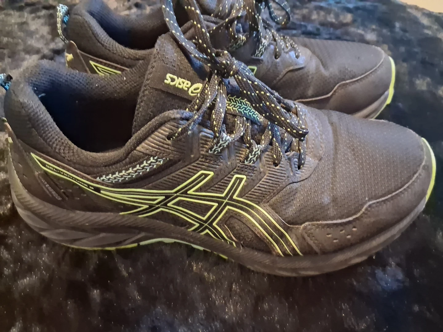 ASICS Gel-Venture 8 running shoes in black with lime green accents. These trail running shoes feature a durable design and a grippy sole. They're perfect for hitting the trails or for everyday wear.