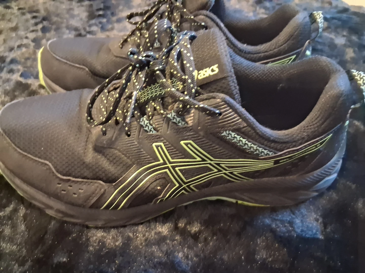 ASICS Gel-Venture 8 running shoes in black with lime green accents. These trail running shoes feature a durable design and a grippy sole. They're perfect for hitting the trails or for everyday wear.