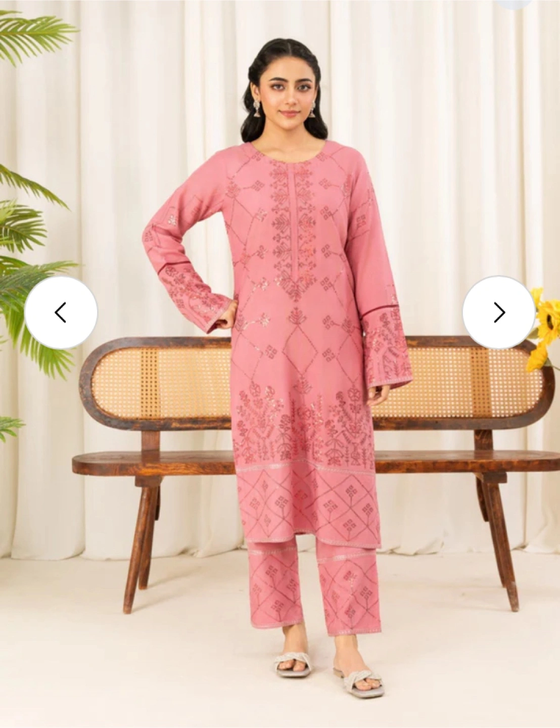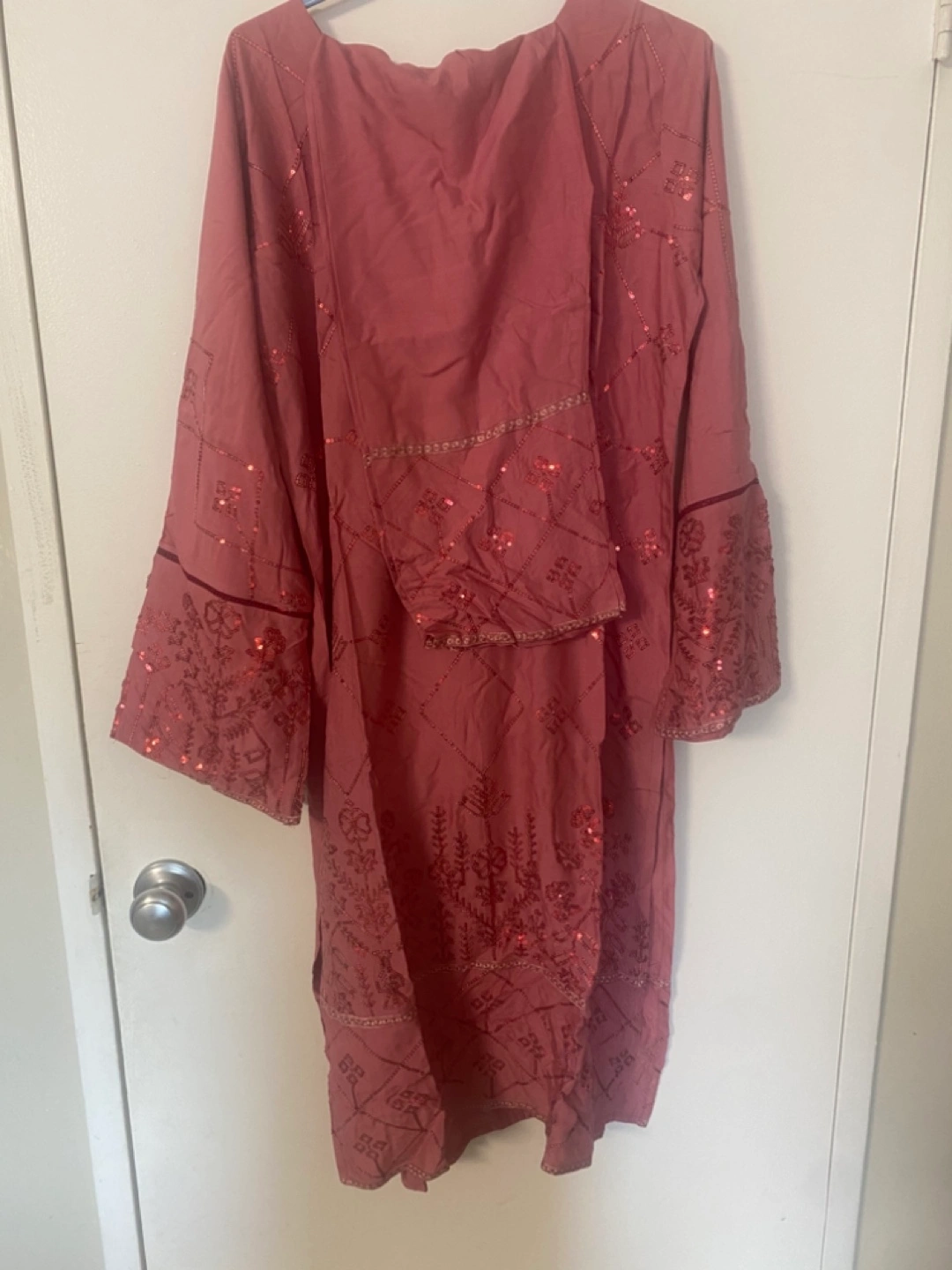 This is a pretty pink Kurti and pantset. The fabric has subtle embroidery. Perfect for a casual occasion or for everyday wear