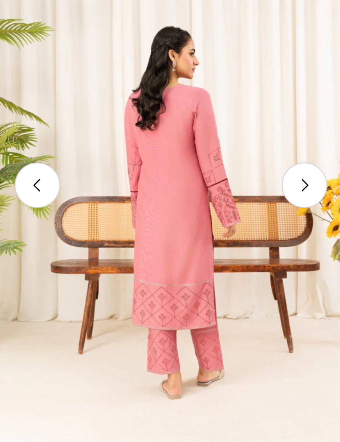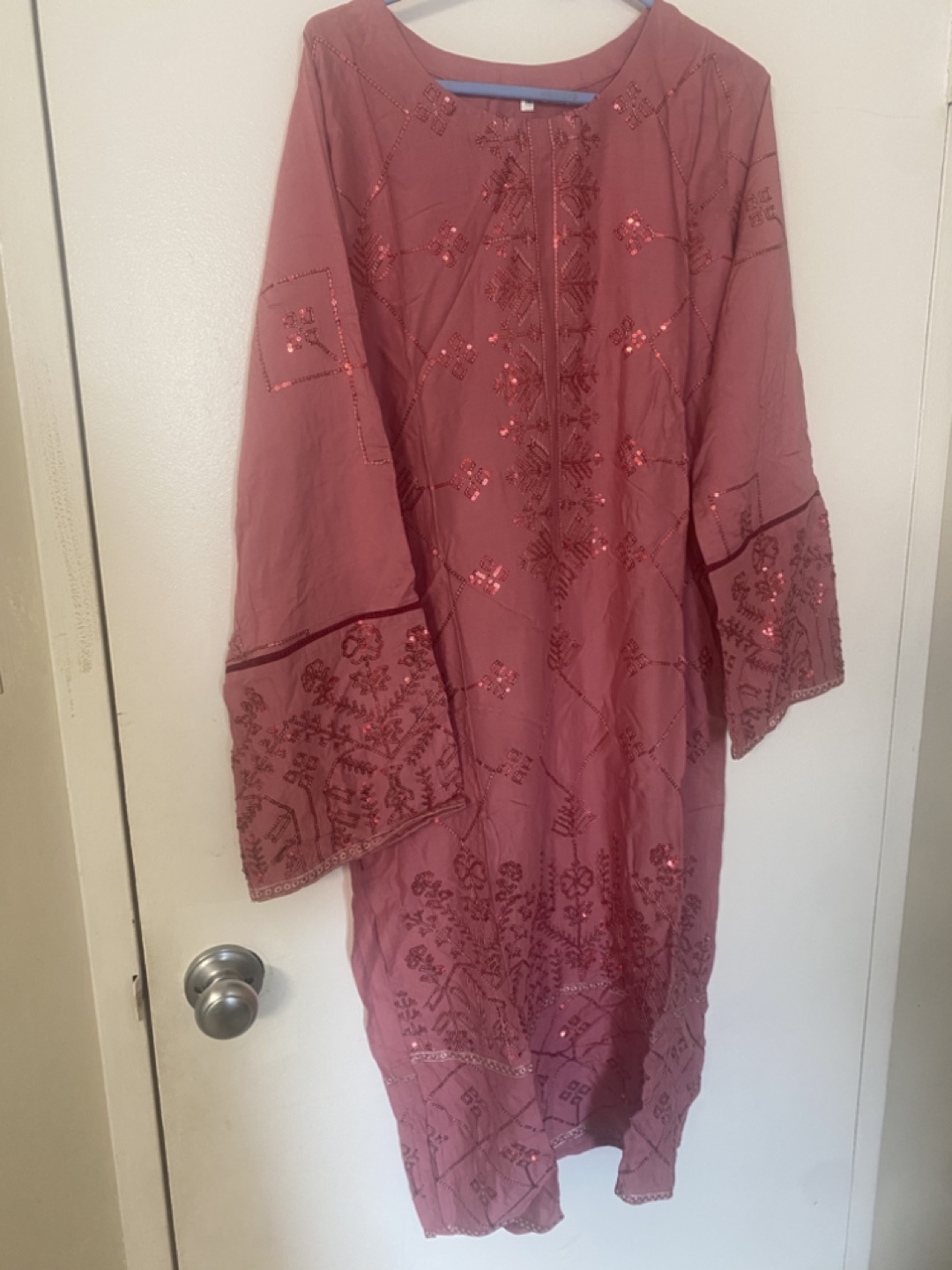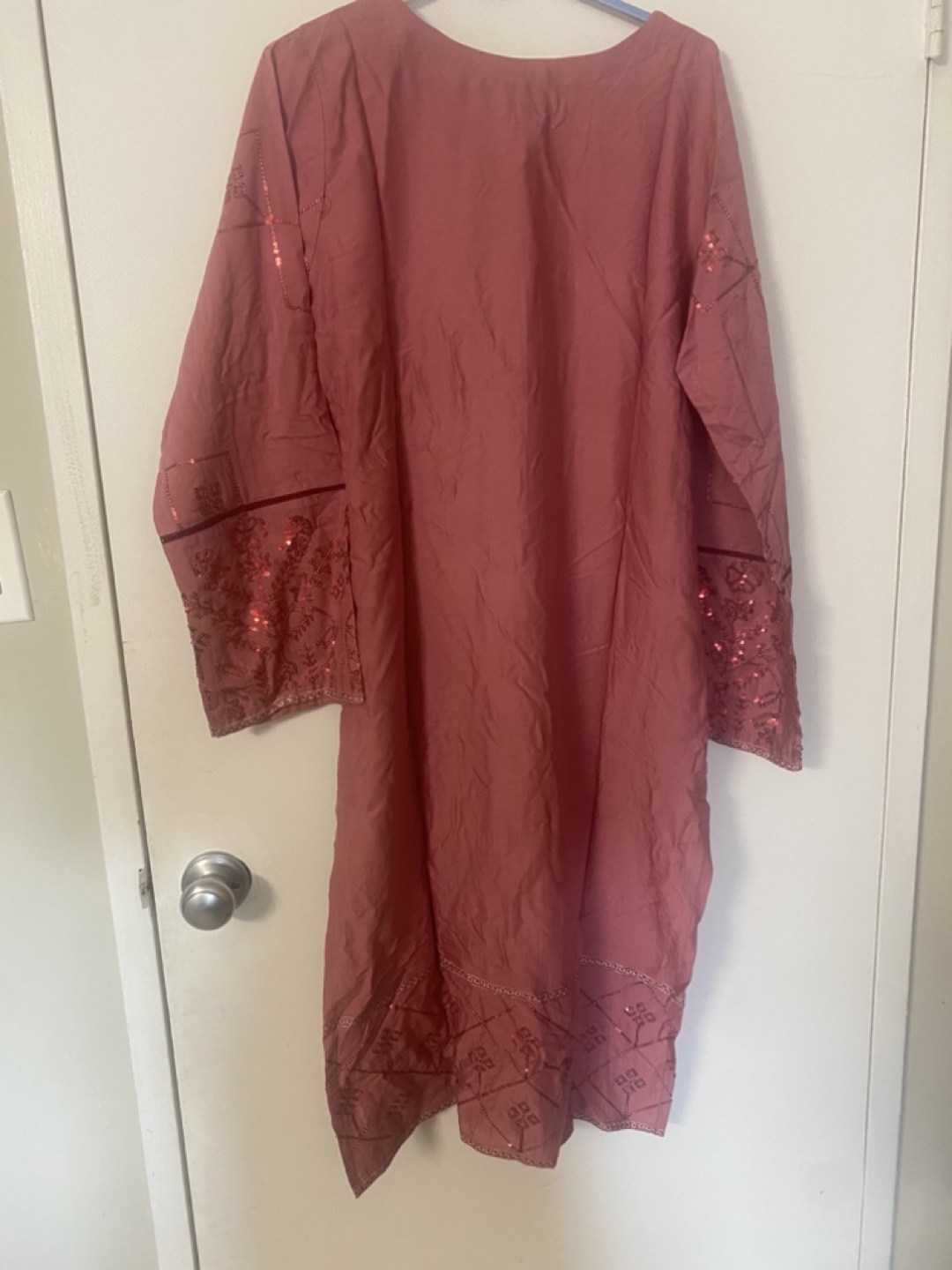 This is a pretty pink Kurti and pantset. The fabric has subtle embroidery. Perfect for a casual occasion or for everyday wear
