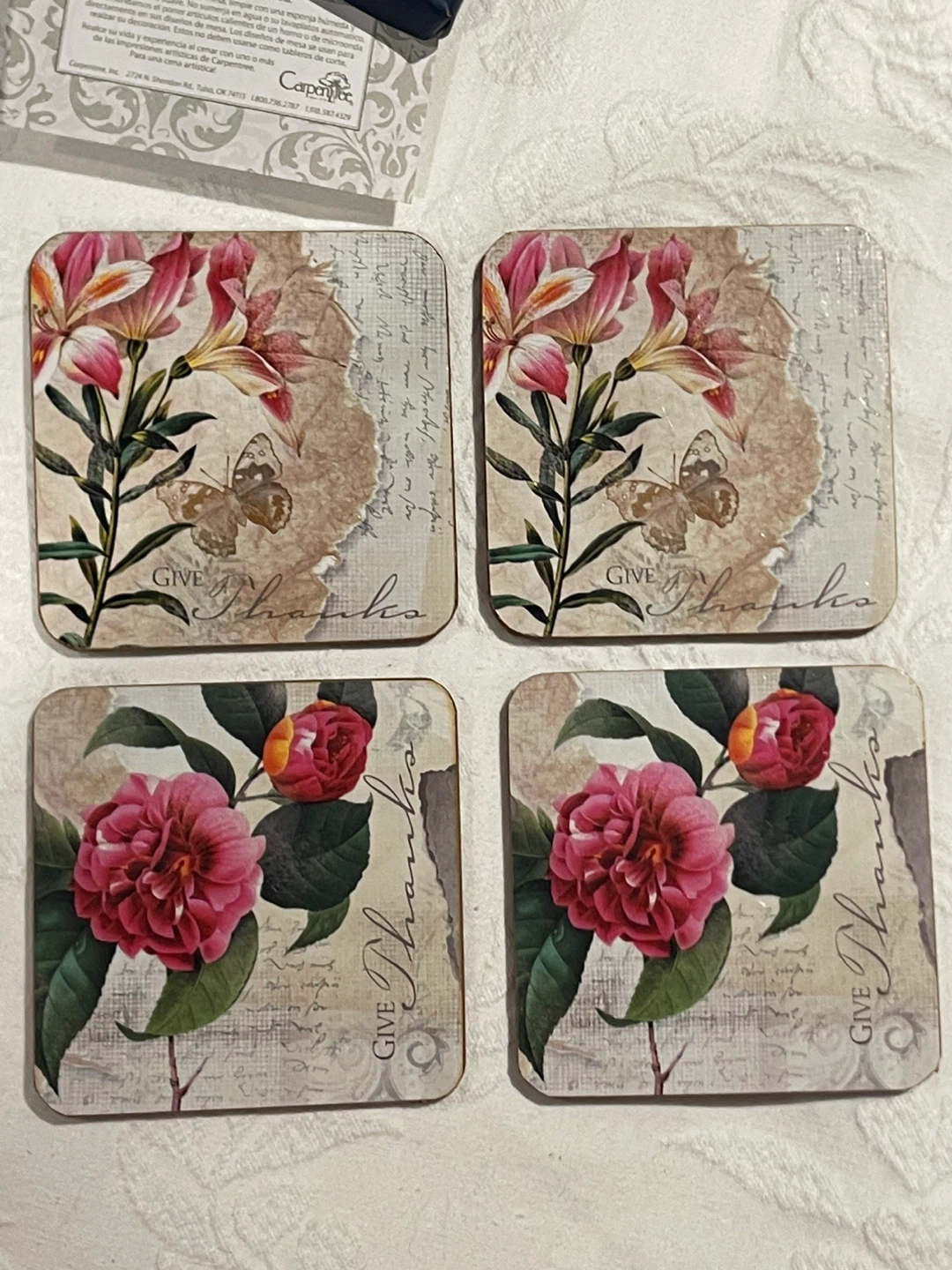 Selling a set of Carpentree Artistic Impressions placemats and coasters. They are made from hardboard and cork backed, and feature lovely floral designs. The care instructions are included, so you can keep them looking their best!