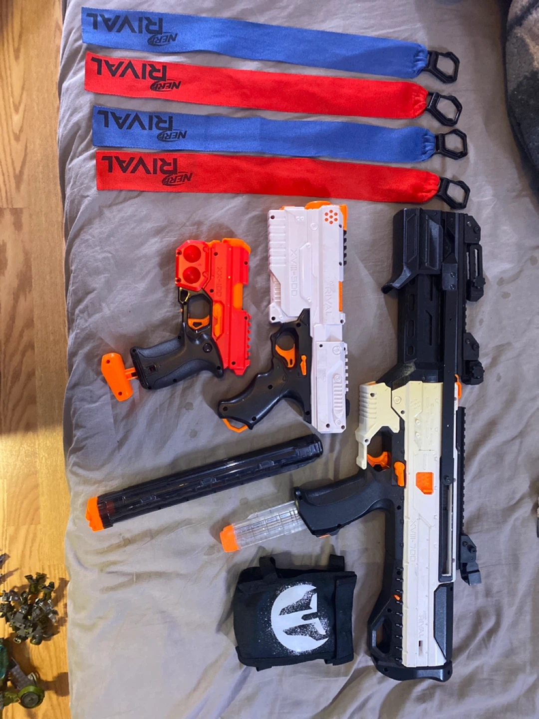 Selling a collection of Nerf Rival blasters and accessories! Includes the Nerf Rival XVIII-700 and Nerf Rival XX-100 blasters, along with Rival team colour armbands
