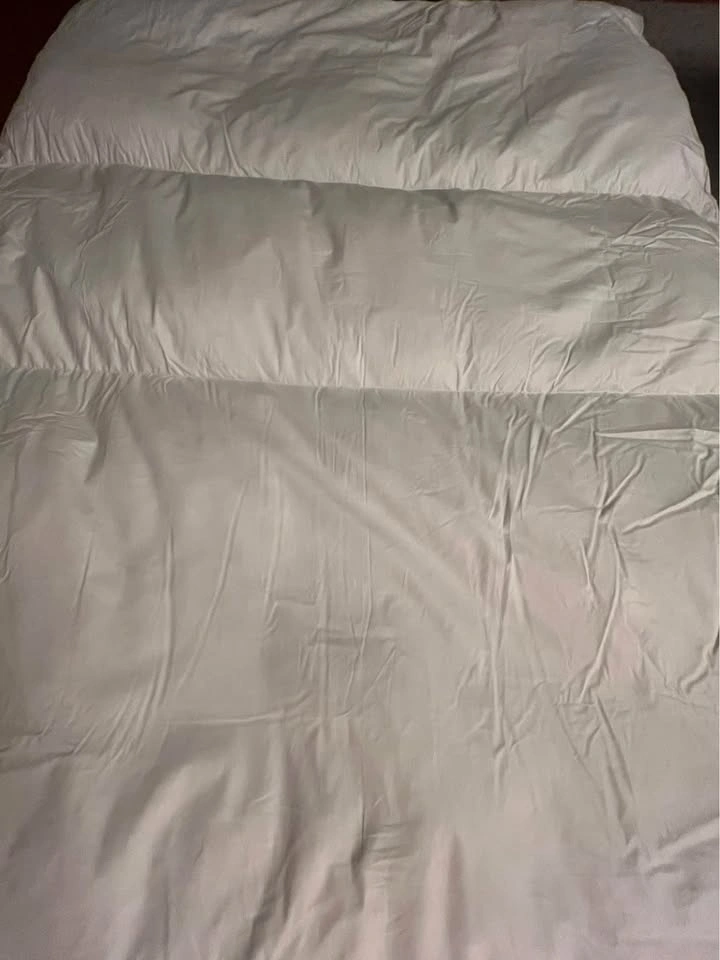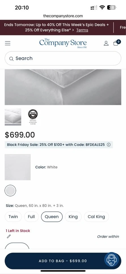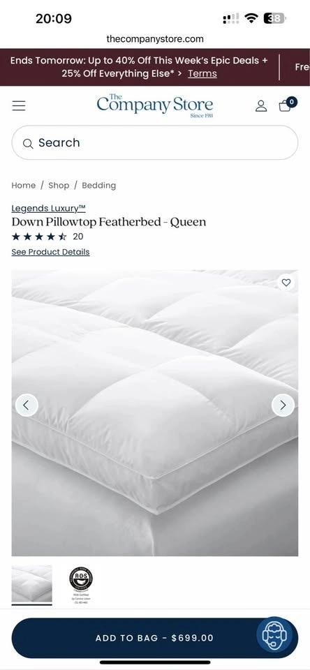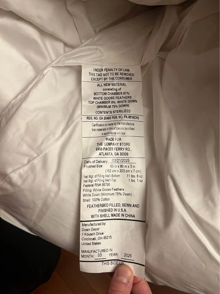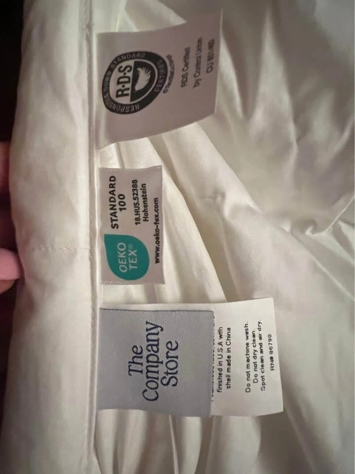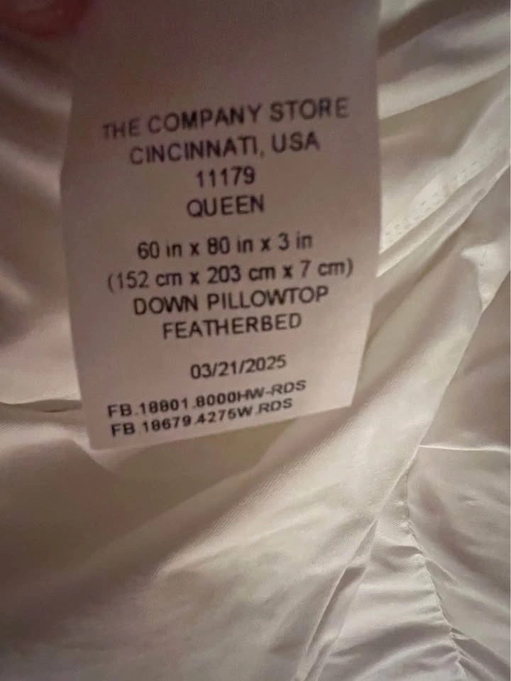 This is a brand new, luxurious two-layer pillowtop featherbed from The Company Store, designed for ultimate softness and comfort. The bottom layer is filled with Hungarian white goose feathers for support, topped with opulent Hungarian white duck down for cushioning. The top layer features a 300-thread count cotton sateen shell with 10” baffle-box stitching to keep the down evenly distributed. It's expertly finished with double-stitched knife edging and a 3” gusset. The down fill is 100% RDS certified, and the materials are OEKO-TEX® STANDARD 100 certified, ensuring safety from harmful substances. Assembled in the USA of fine imported materials. Originally $699 USD (approx. $985 CAD).