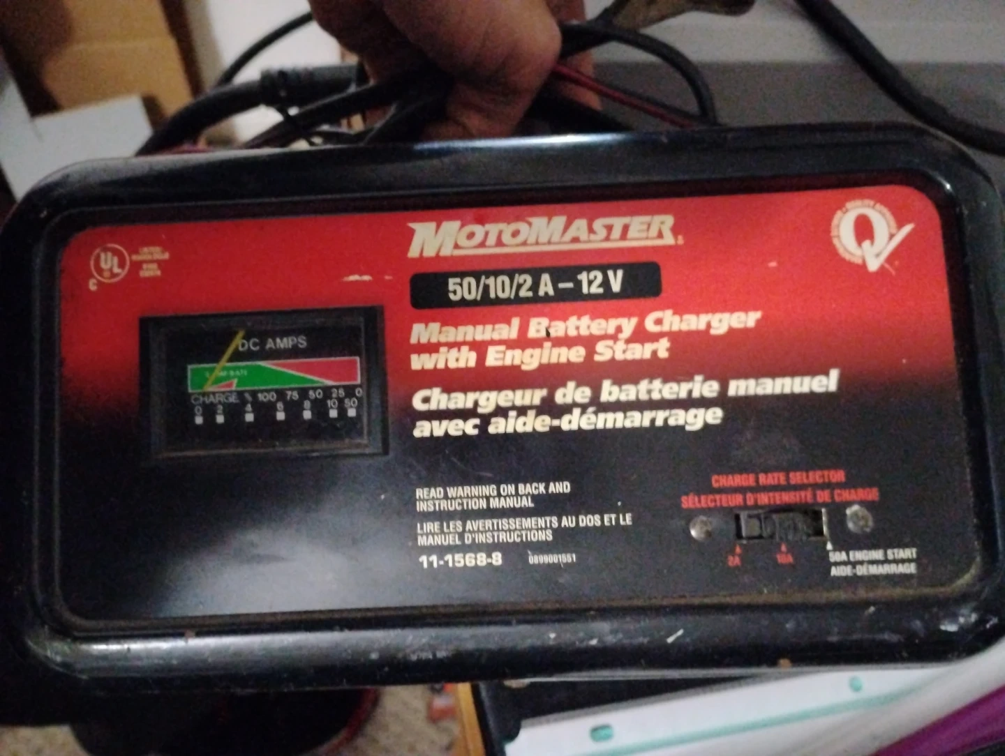 This is a MotoMaster 50/10/2 A, 12 V manual battery charger. It includes an engine start function. The charger has a charge rate selector and a DC amps meter.