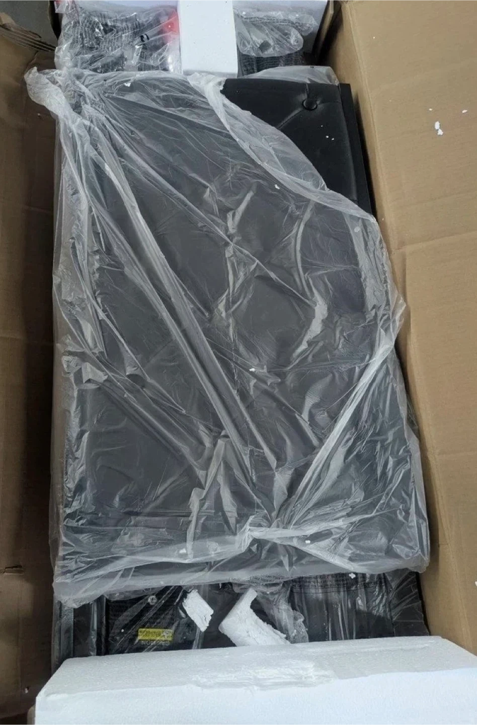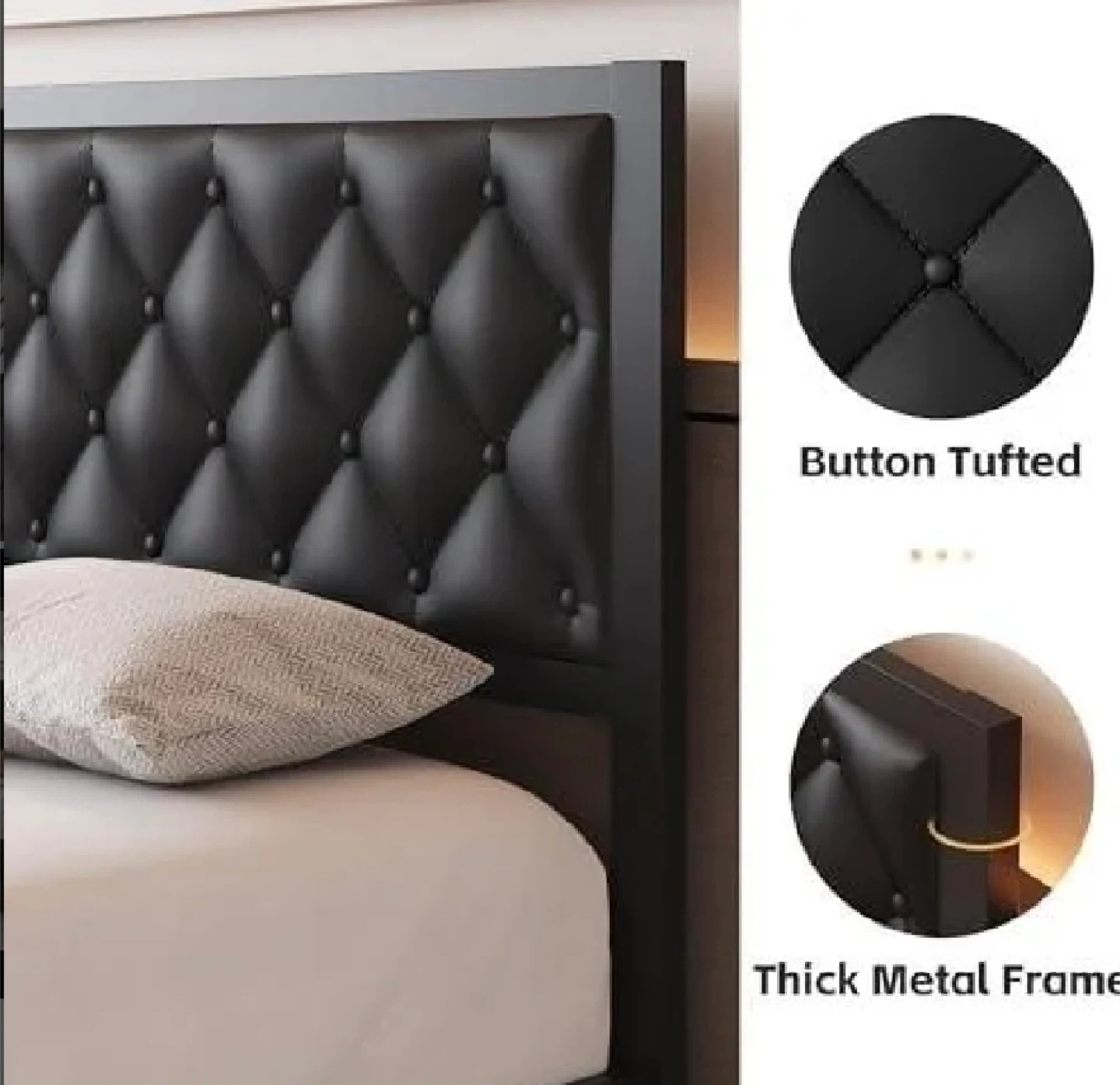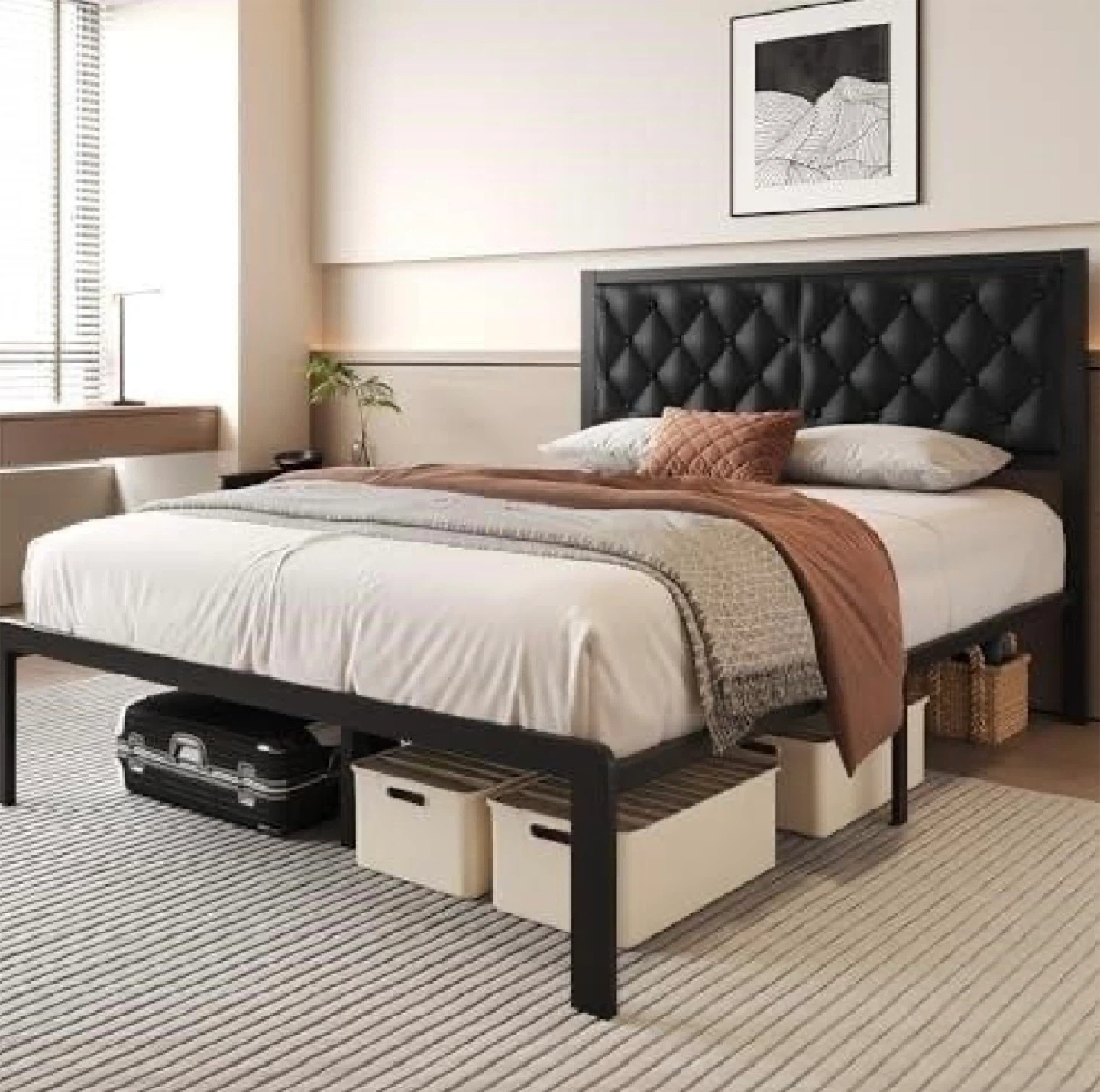 Queen size bed frame with a black, button-tufted headboard. It features a thick metal frame construction and a slatted support system. Overall dimensions are 80.6" L x 59.2" W x 41.5" H. Under-bed clearance is 14" for storage.