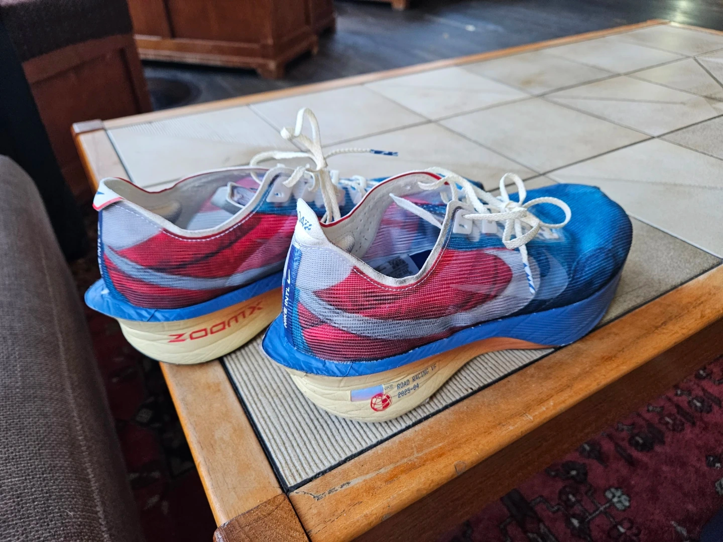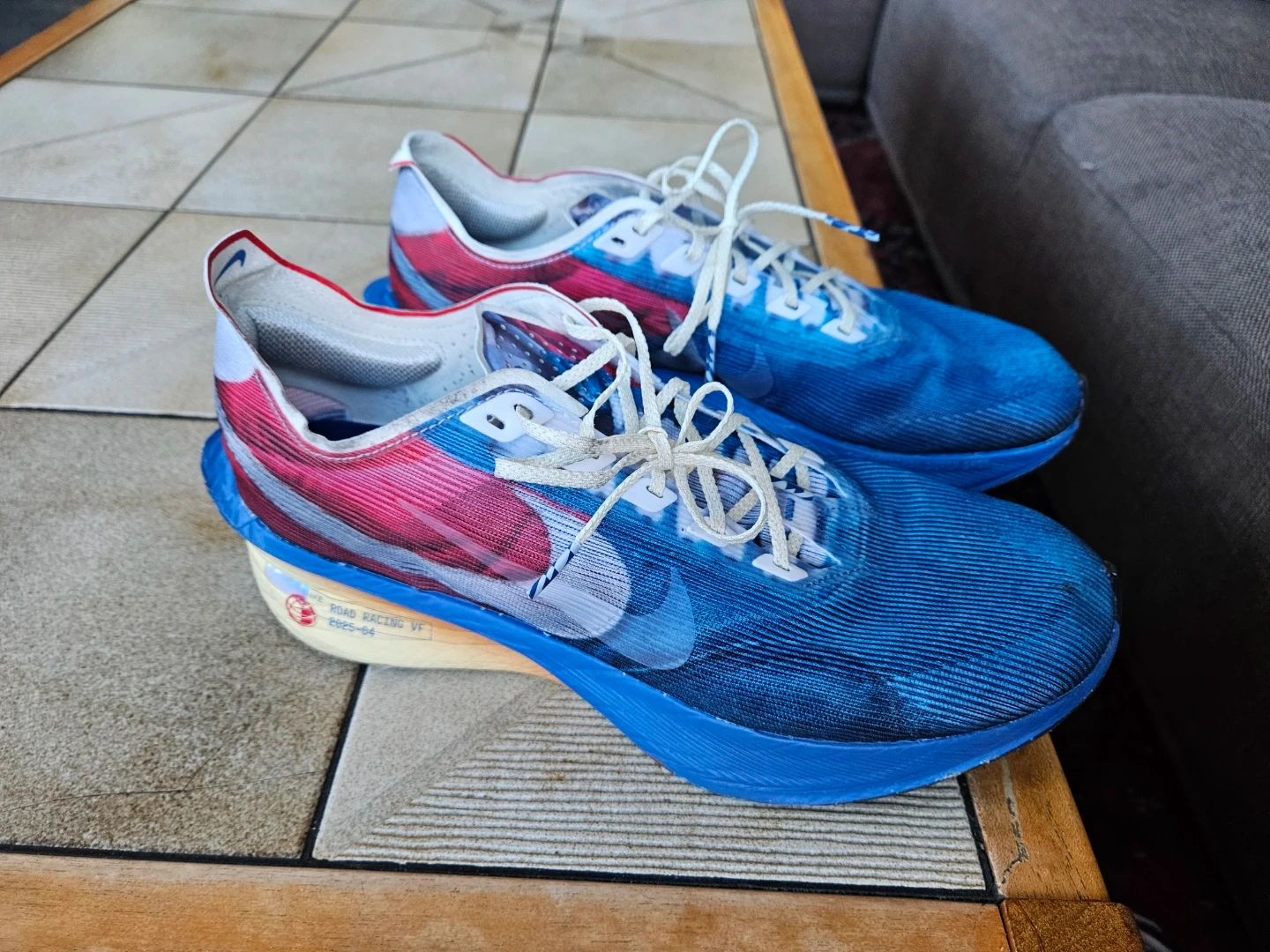 Worn literally twice. The carbon-plate race day shoe that broke the marathon record. Blue Joy/Red colorway, April 2025 manufacture. ZoomX foam barely