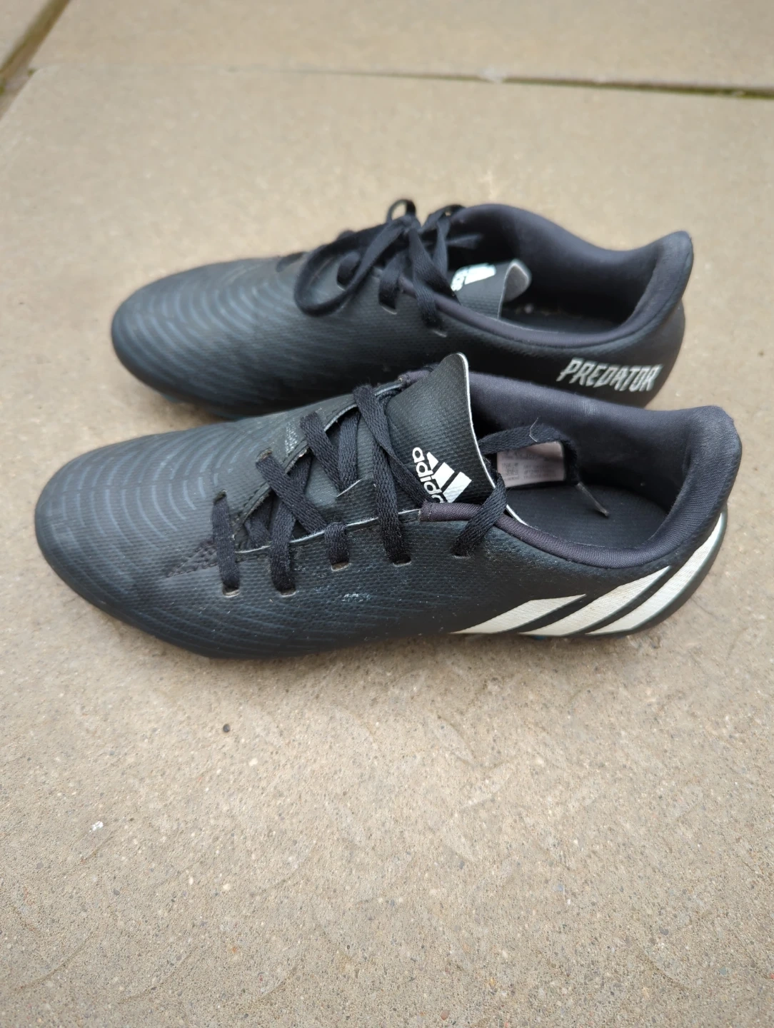 Black Adidas Predator soccer cleats with white stripes. These cleats are designed for artificial grass or firm ground. They're good for playing on turf fields!