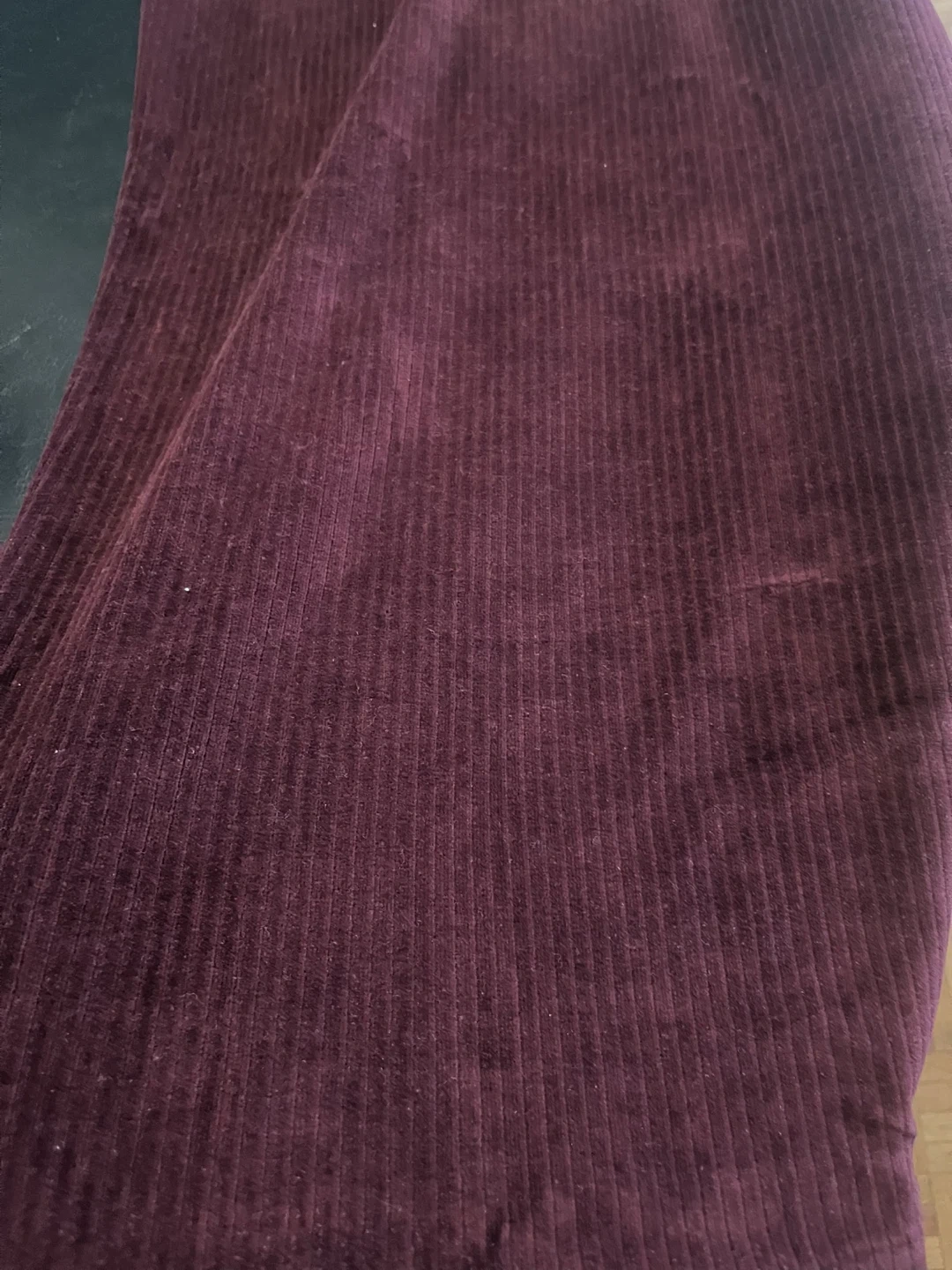 Deep burgundy velour fabric. It's a soft material with distinct wales. Measures approximately 1.5 yards long. Perfect for upholstery or clothing projects!